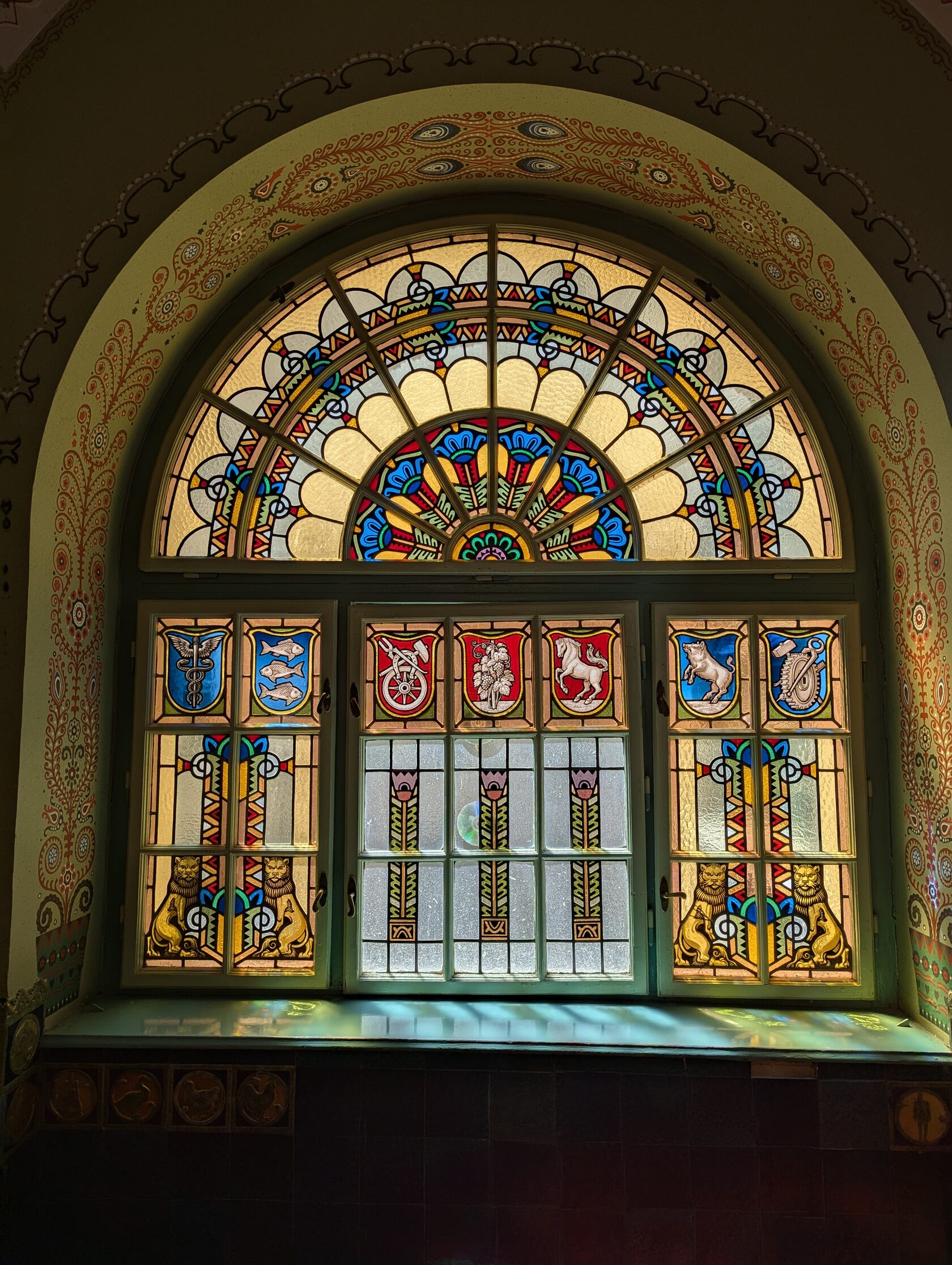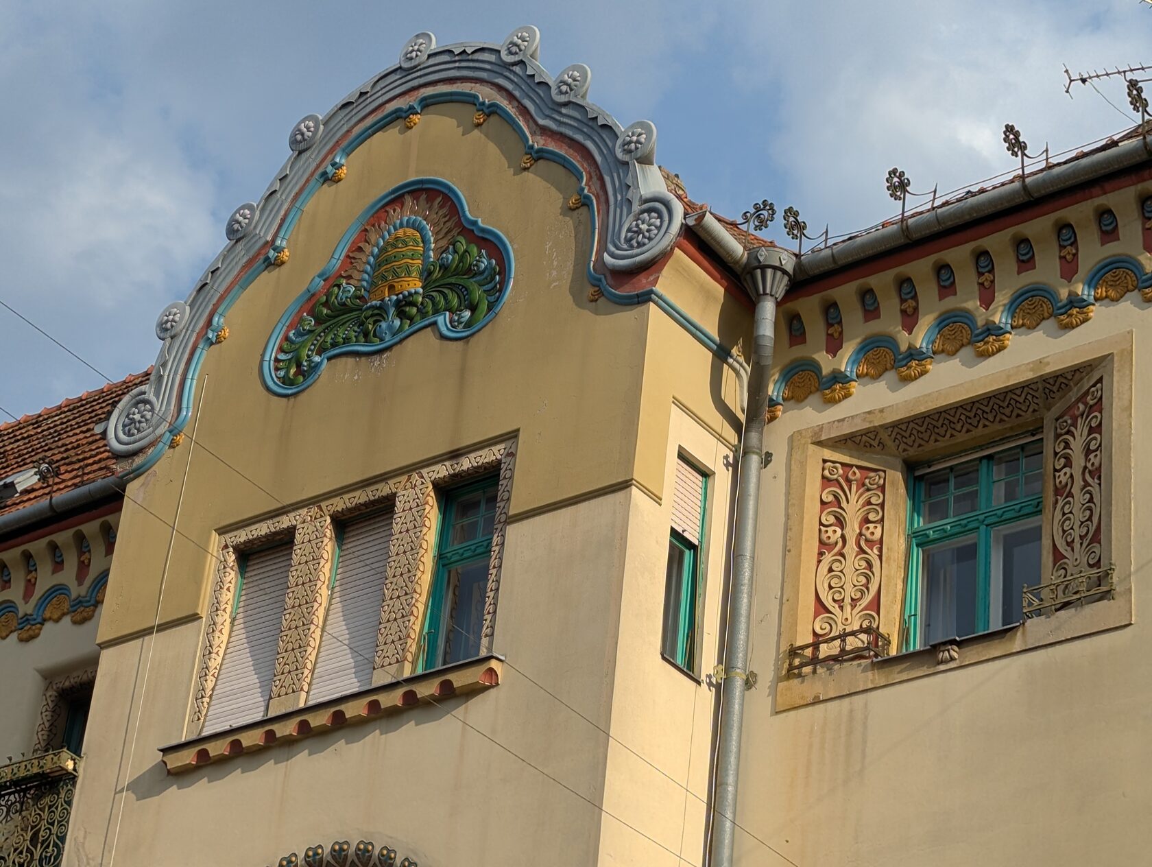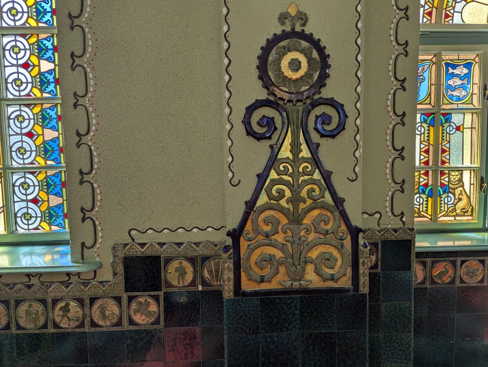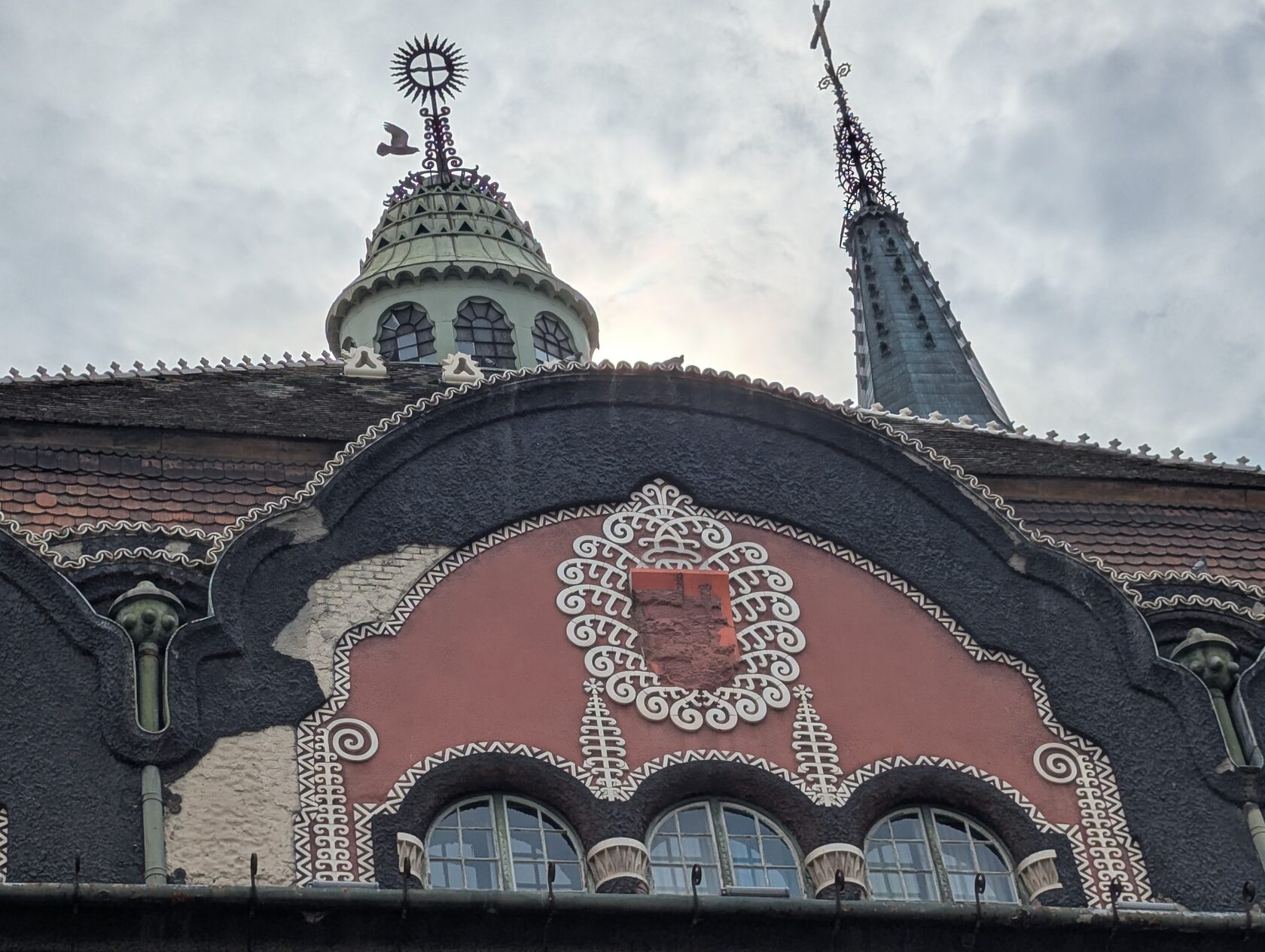 Здесь всё про орнамент: тюльпаны, розы и лилии, павлиньи перья — и на фасадах, и в интерьере, в витражах и росписи. Витражи делали в мастерской Микши Рота в Будапеште, керамика и черепица — с фабрики в Пече (Жолнаи).
