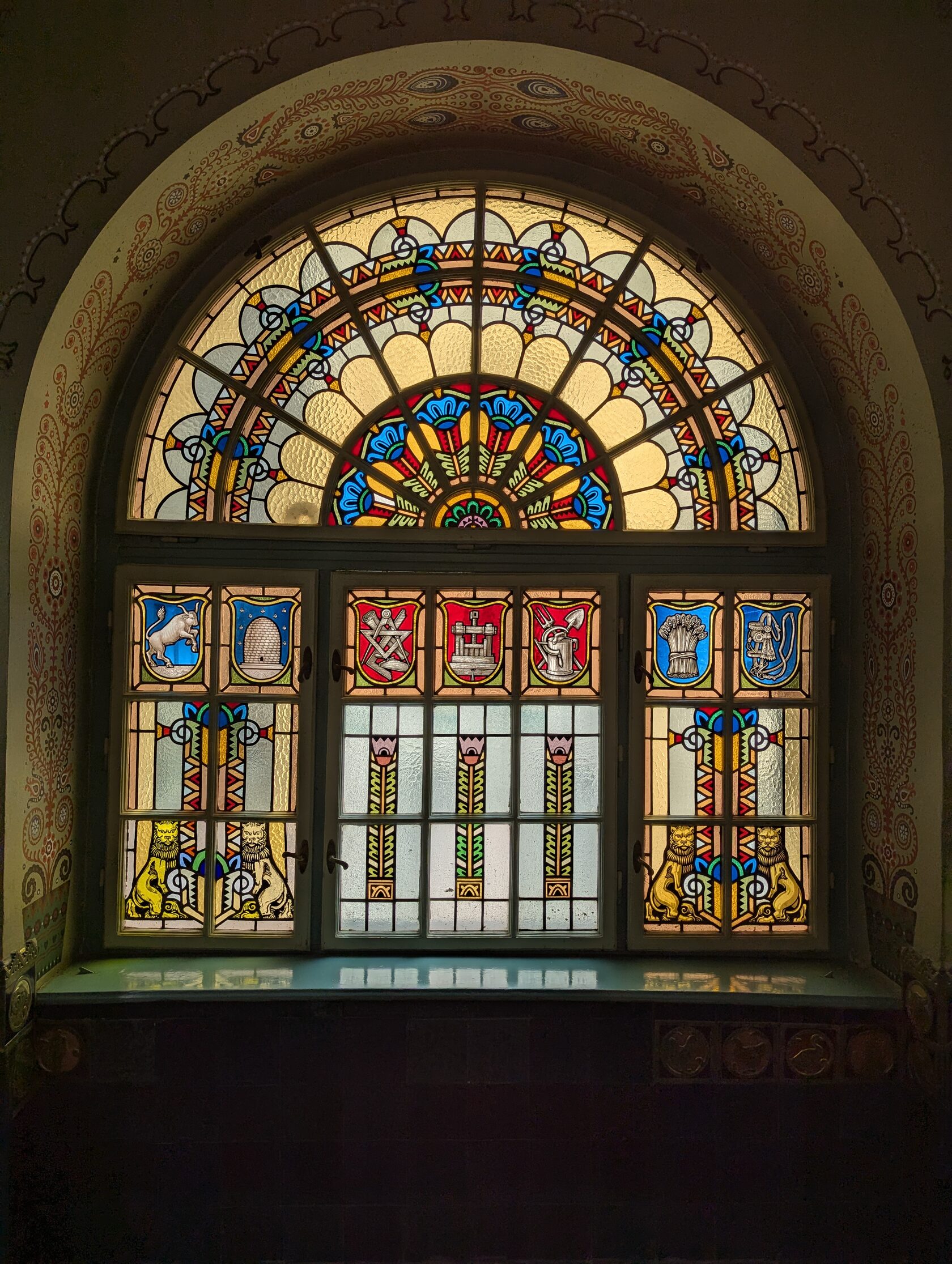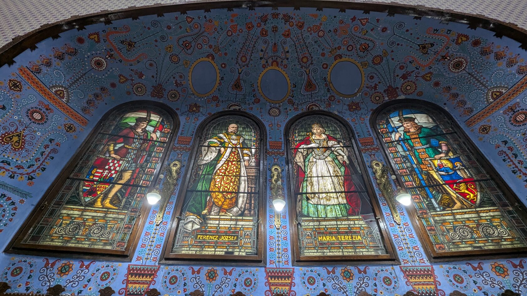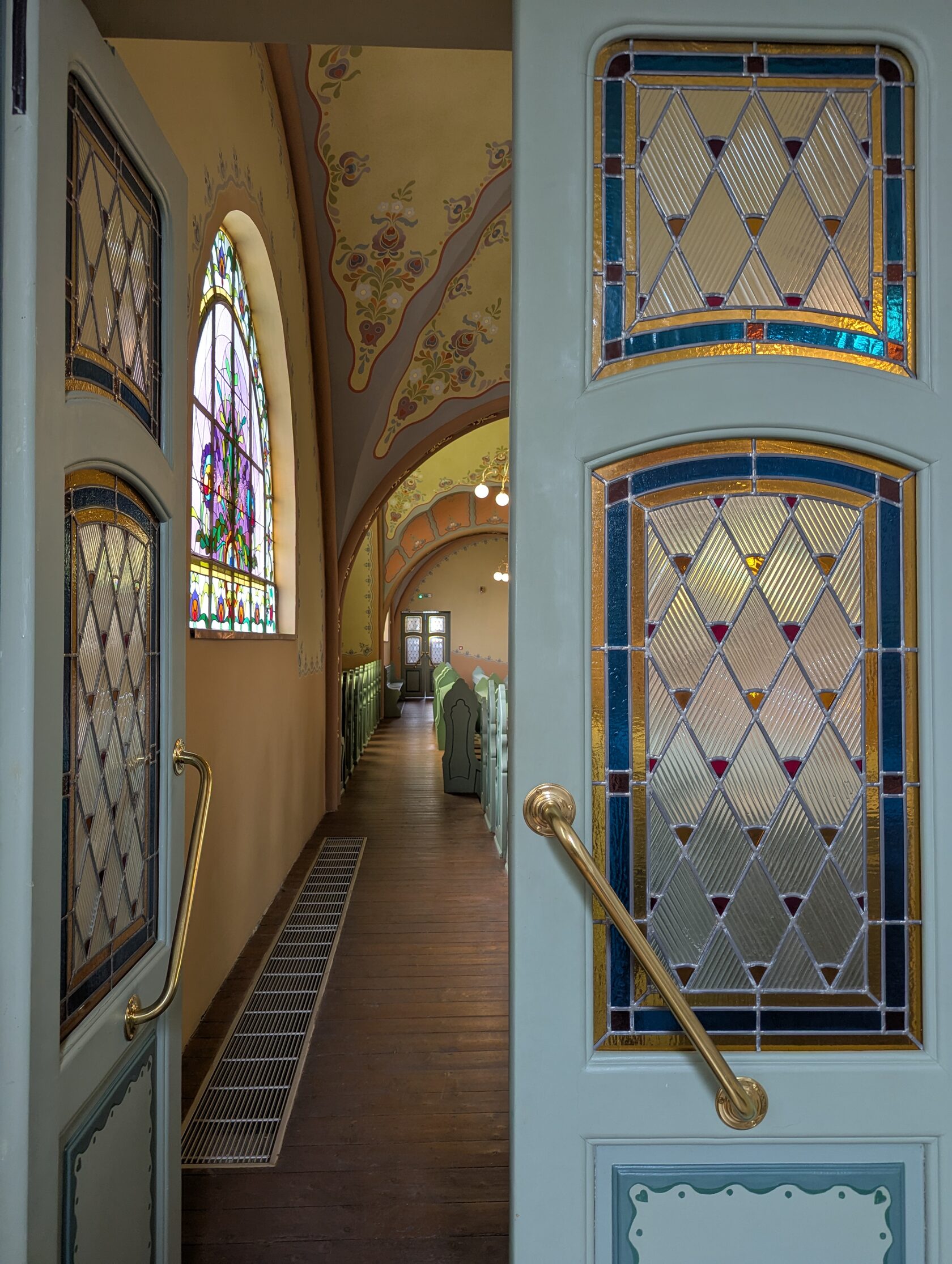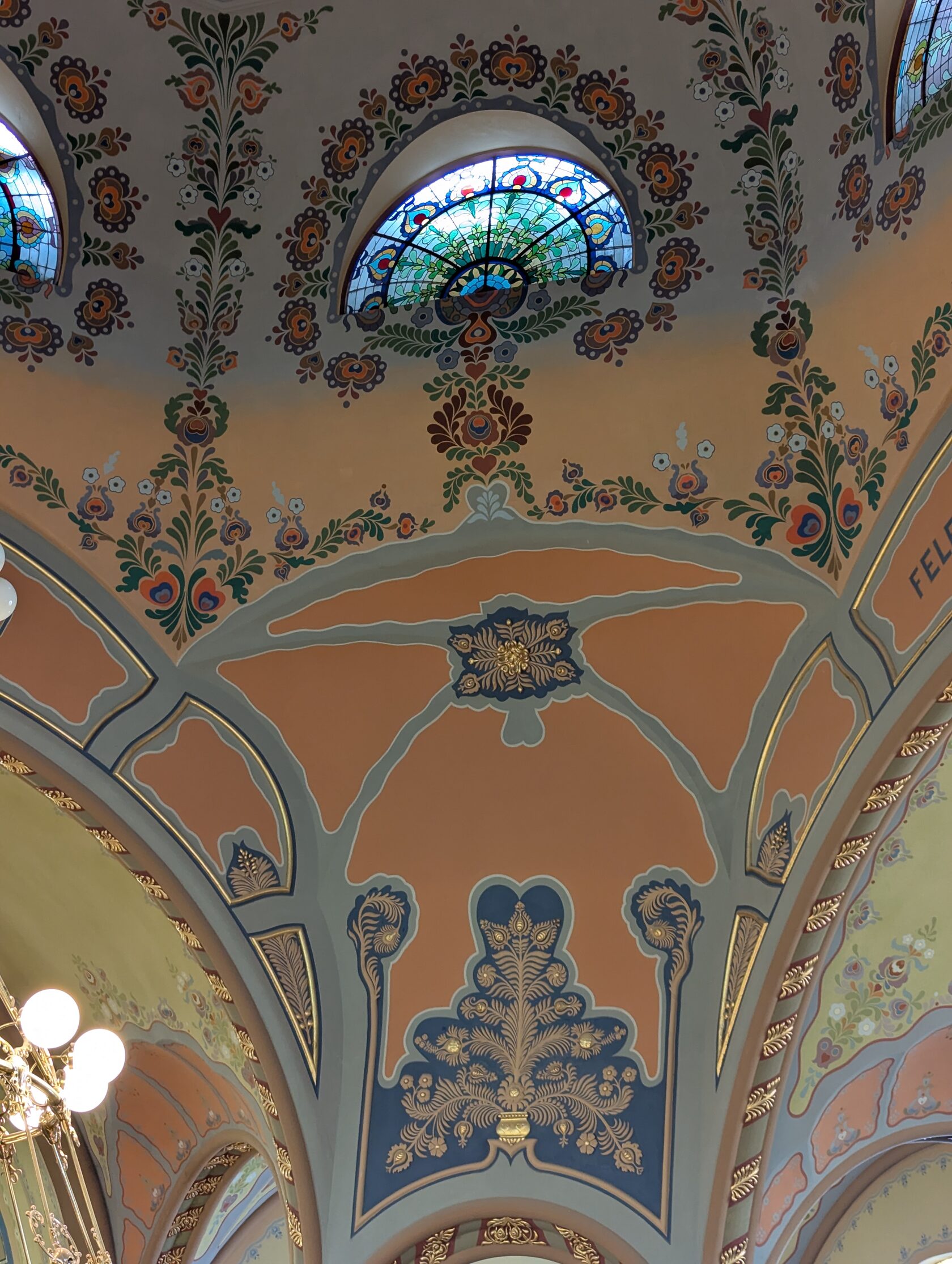 Здесь всё про орнамент: тюльпаны, розы и лилии, павлиньи перья — и на фасадах, и в интерьере, в витражах и росписи. Витражи делали в мастерской Микши Рота в Будапеште, керамика и черепица — с фабрики в Пече (Жолнаи).