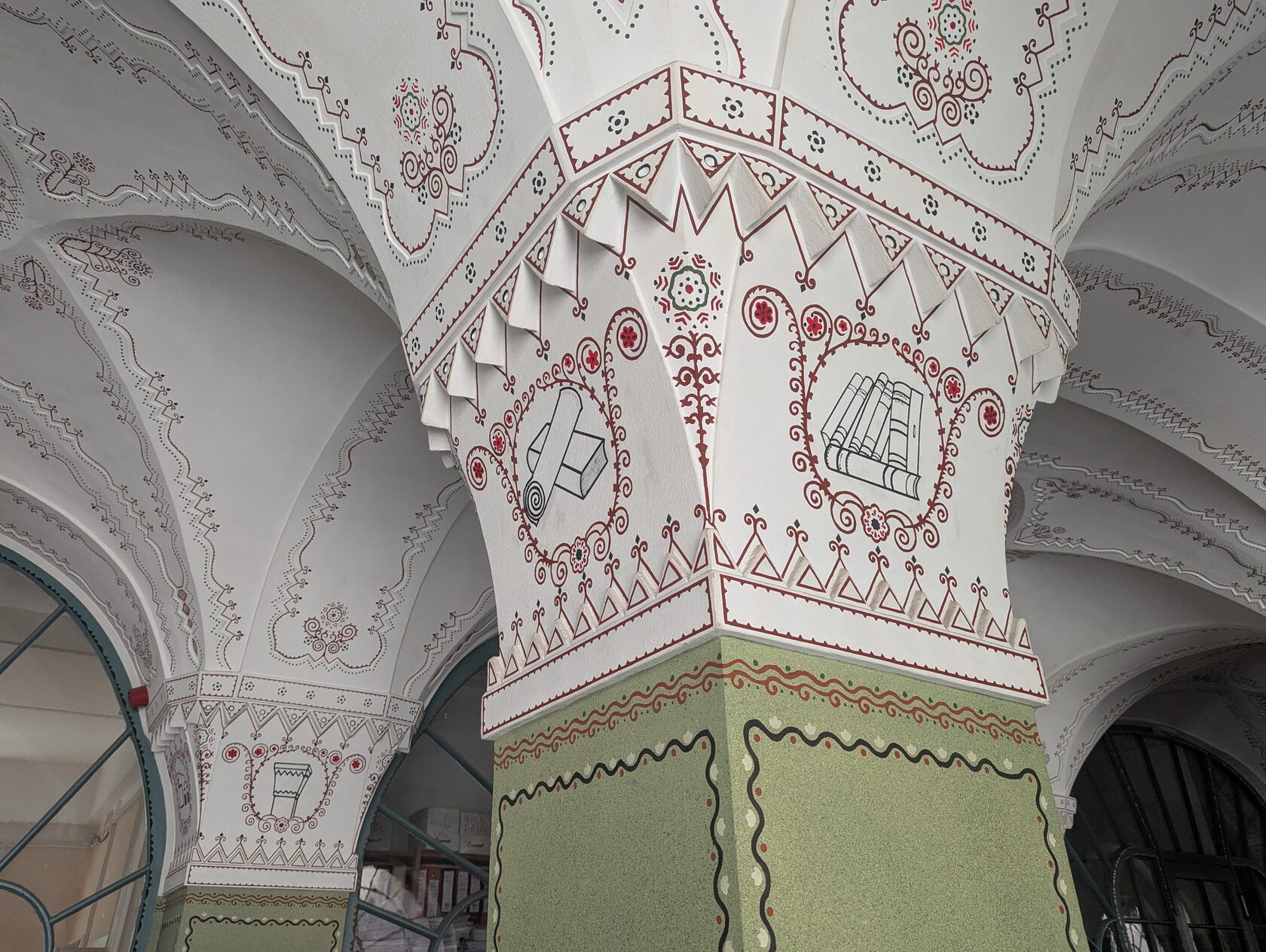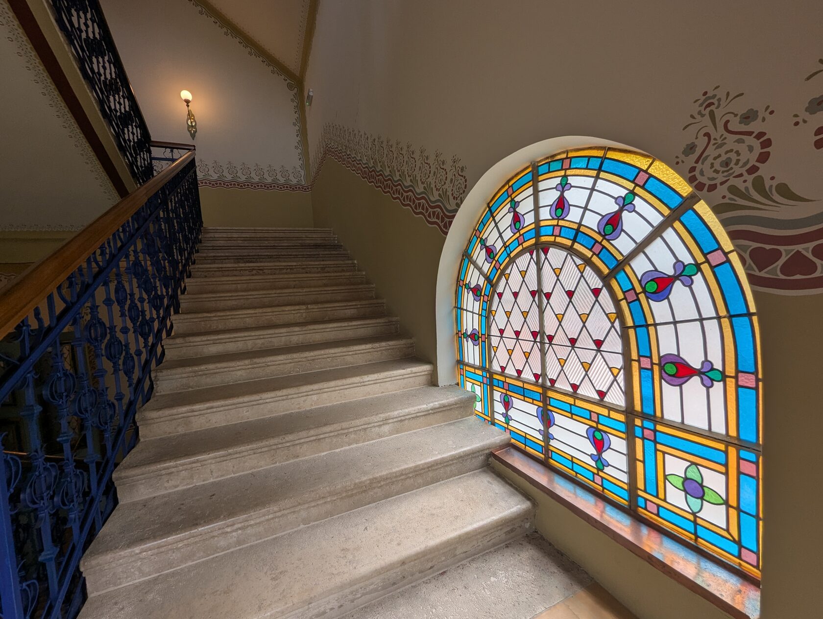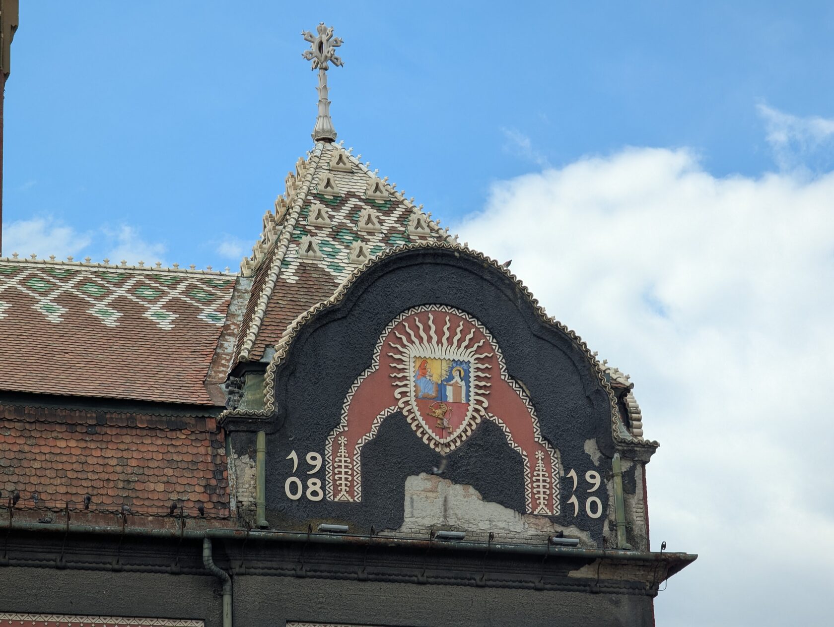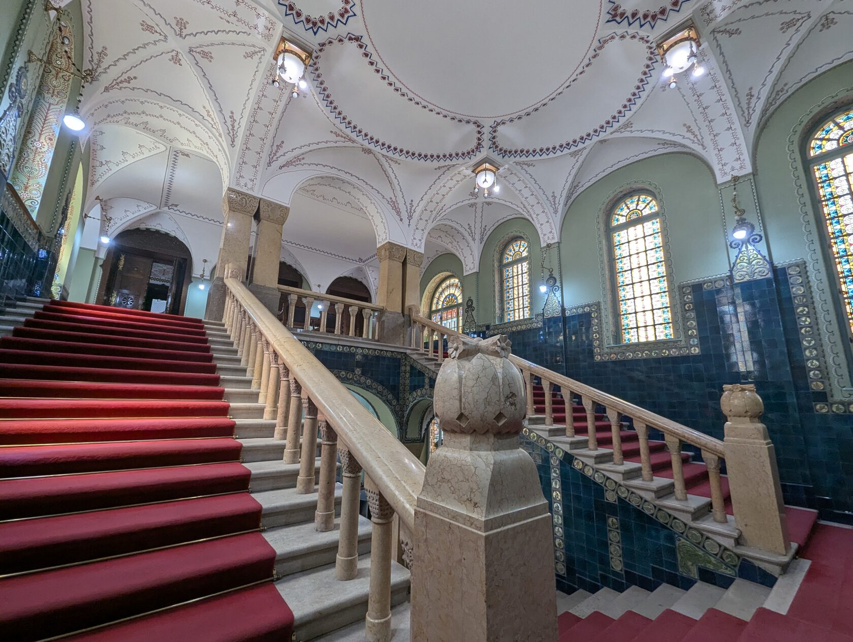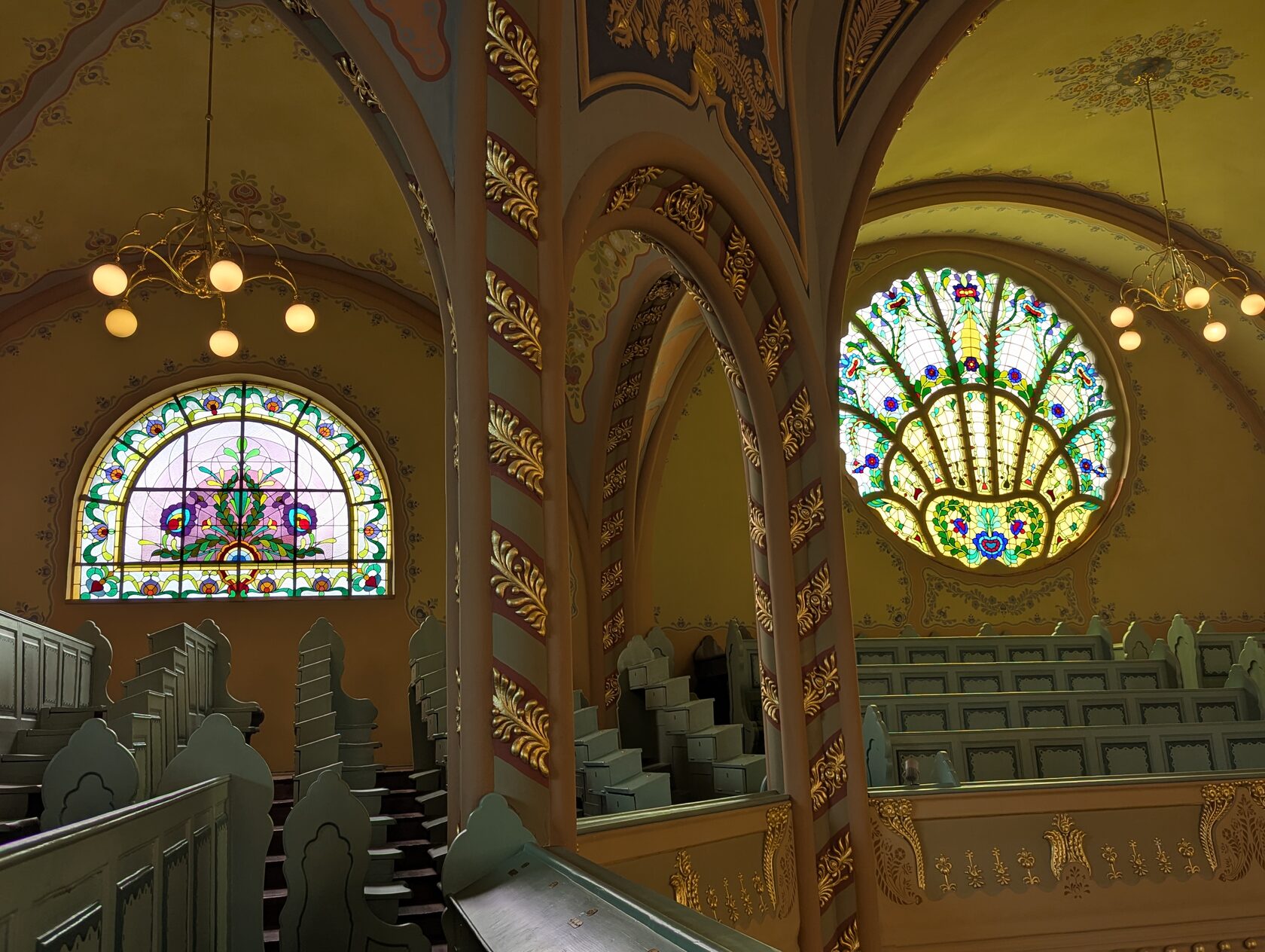 Здесь всё про орнамент: тюльпаны, розы и лилии, павлиньи перья — и на фасадах, и в интерьере, в витражах и росписи. Витражи делали в мастерской Микши Рота в Будапеште, керамика и черепица — с фабрики в Пече (Жолнаи).