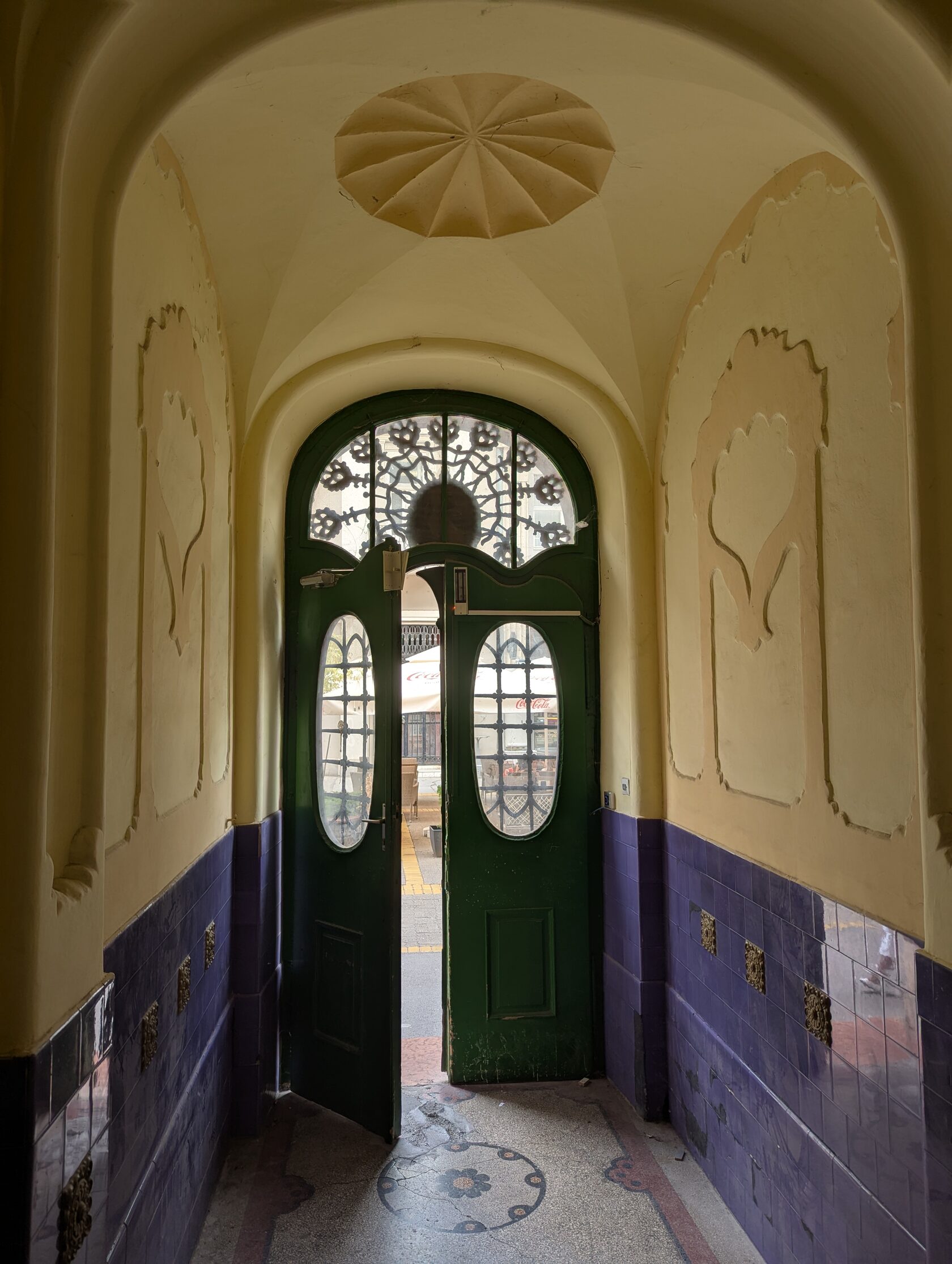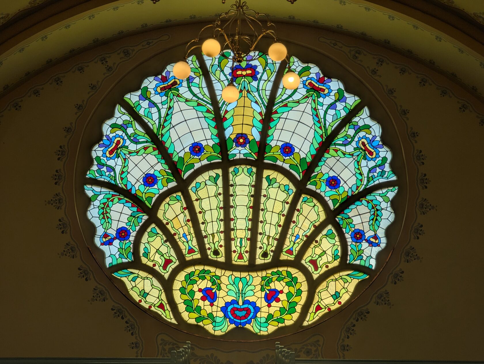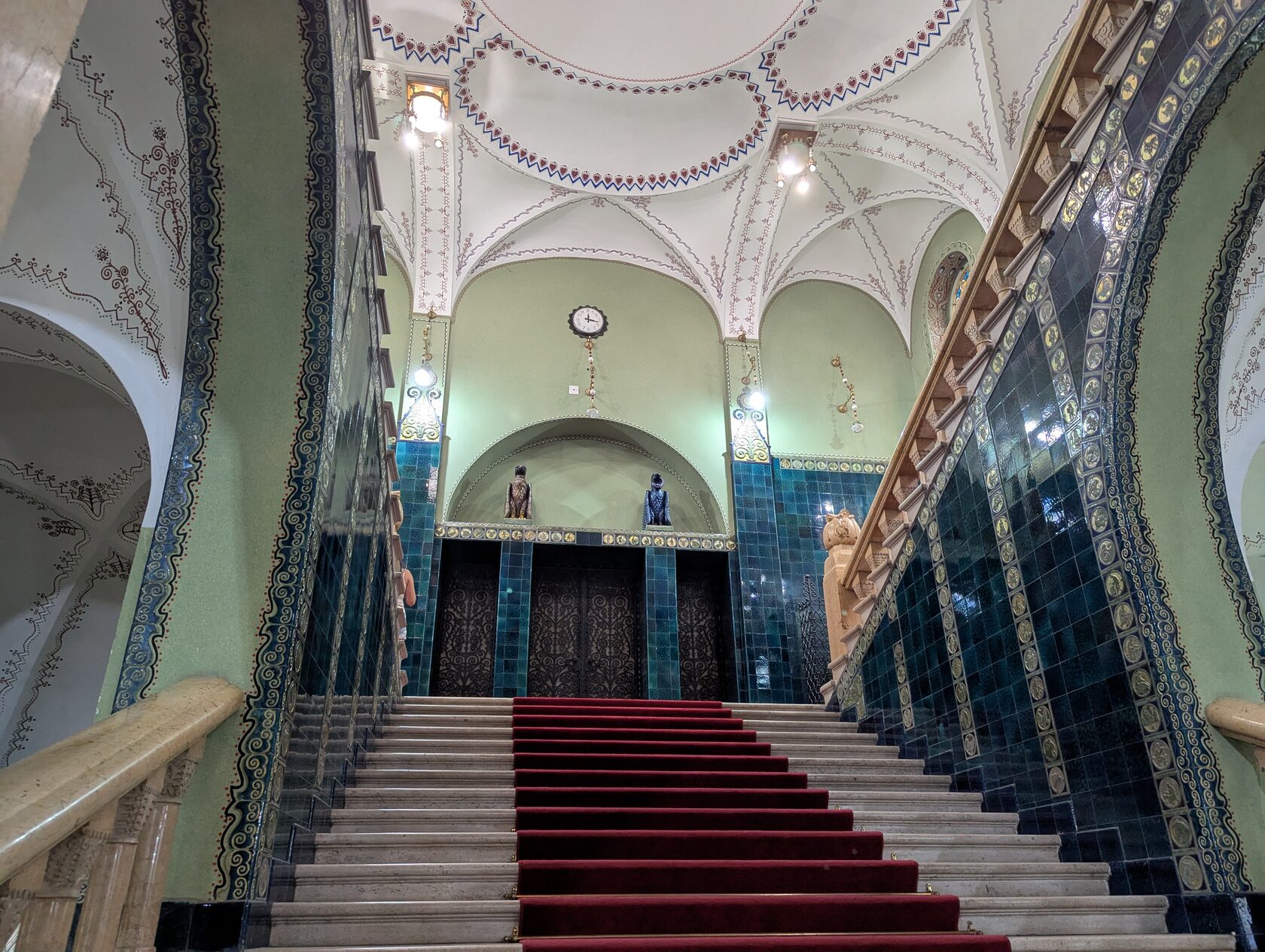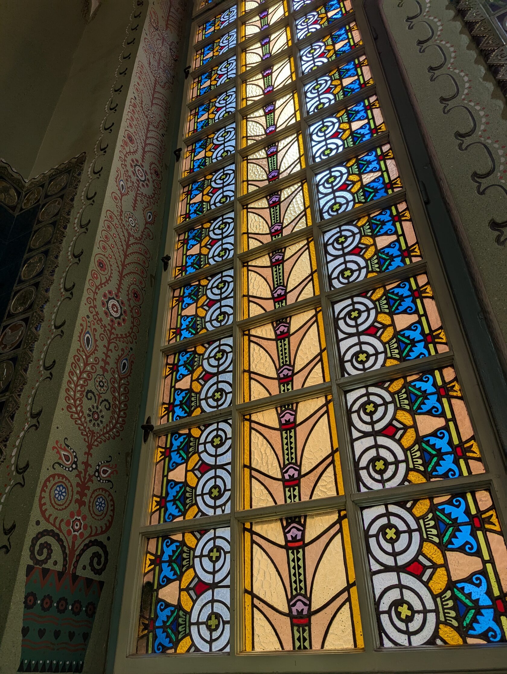 Здесь всё про орнамент: тюльпаны, розы и лилии, павлиньи перья — и на фасадах, и в интерьере, в витражах и росписи. Витражи делали в мастерской Микши Рота в Будапеште, керамика и черепица — с фабрики в Пече (Жолнаи).