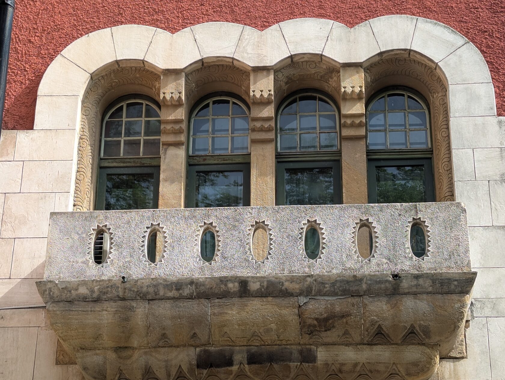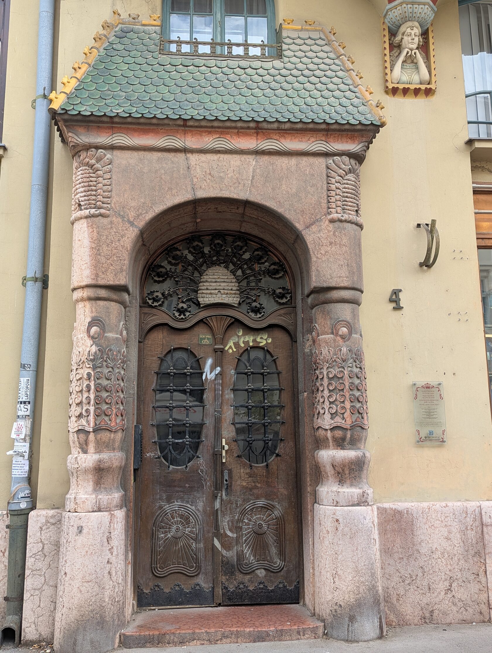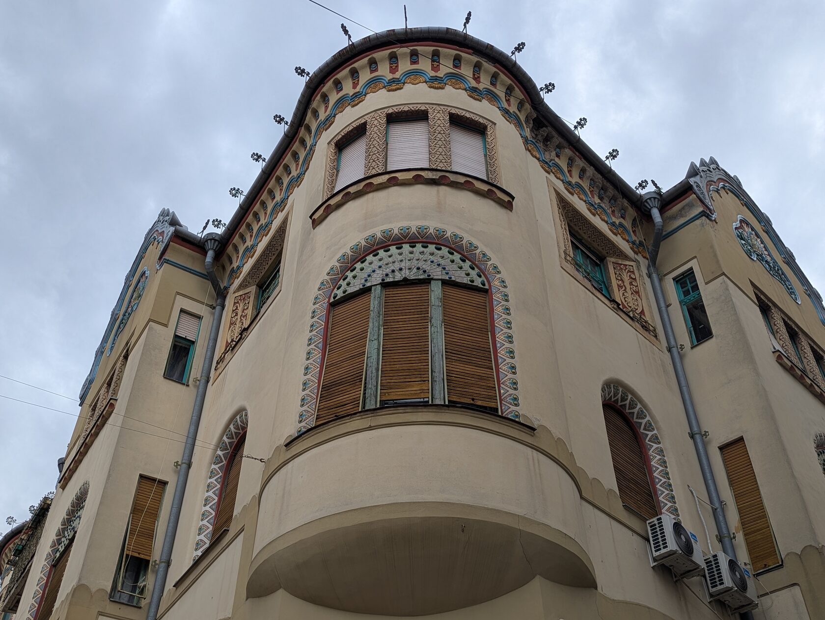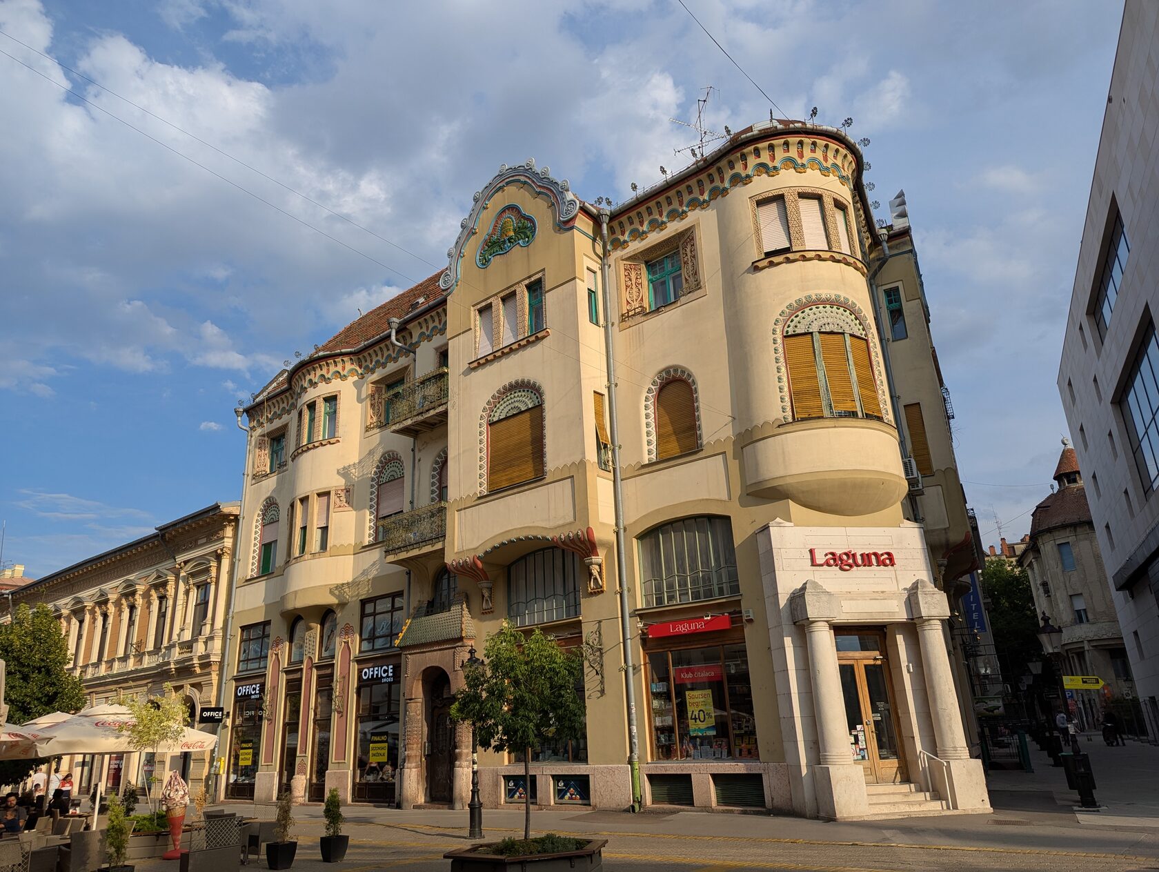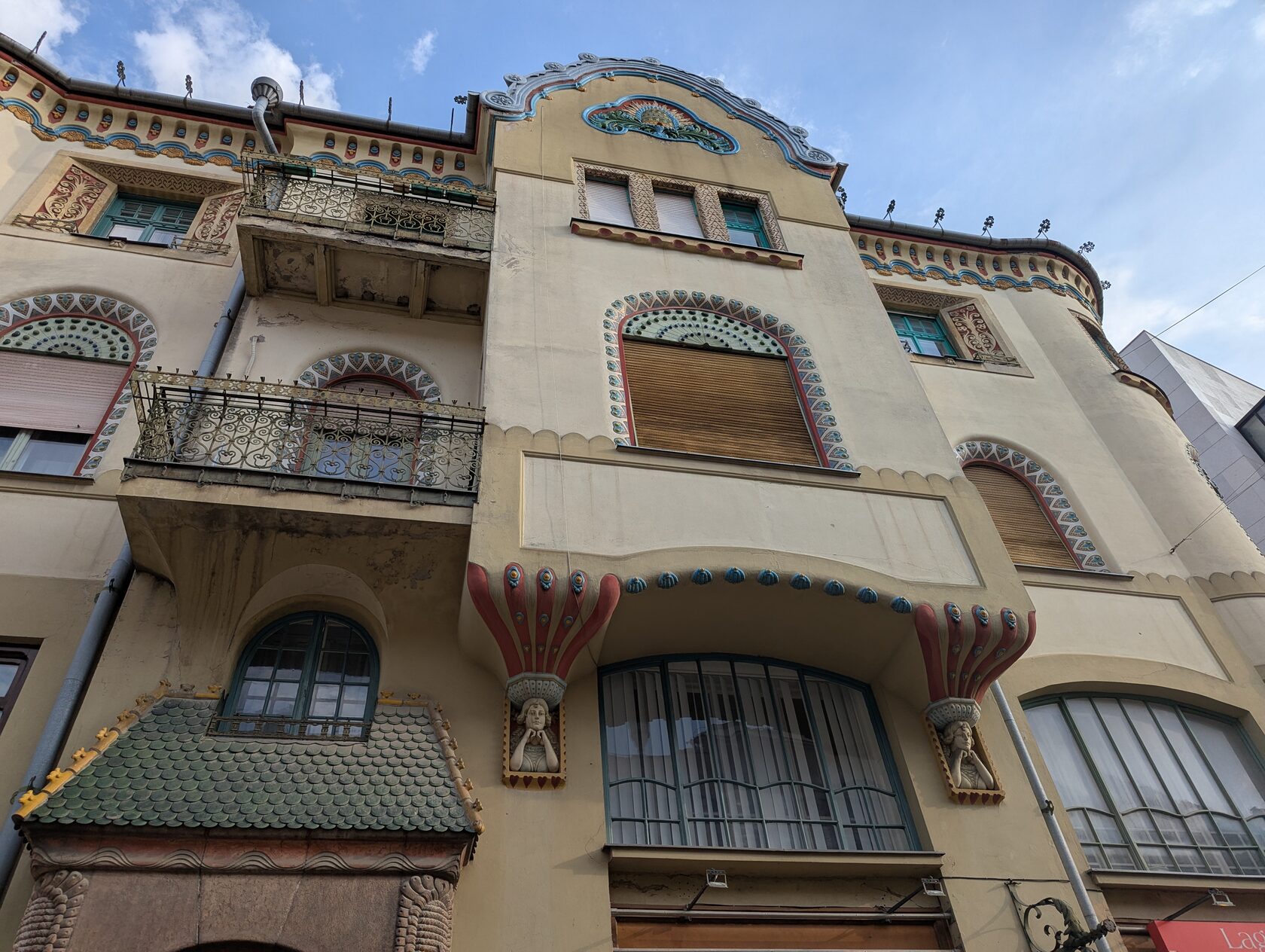 Фасад изящно «сворачивает» на углах, верхние этажи щедро украшены керамикой с мотивами народного искусства, есть и каменная резьба — для экономной Суботицы того времени это редкость. На первом этаже впервые в городе массивные стеклянные поверхности вместо камня — и это красиво: лёгкость и свет.