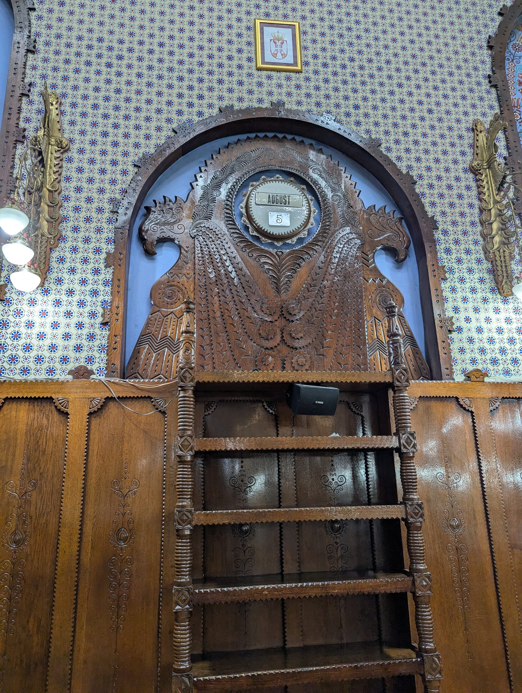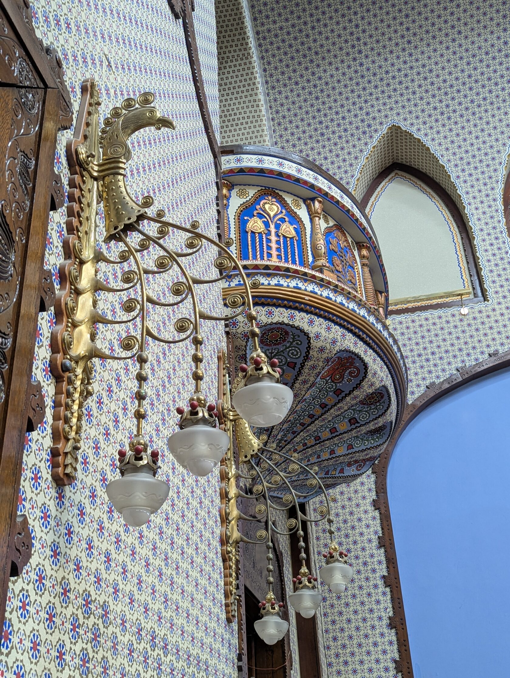 И строгий, при этом красочный алтарь, как в католическом храме, с органом, традиционными и сецессионными витыми светильниками. С формами, отсылающими к ассирийской традиции..