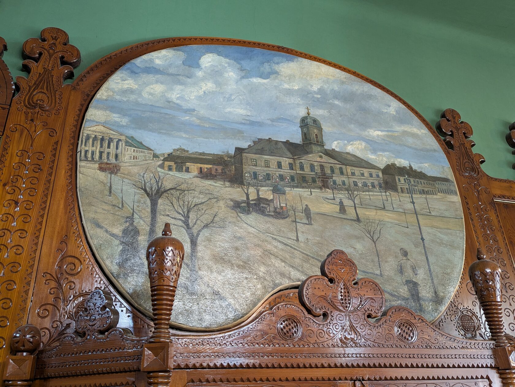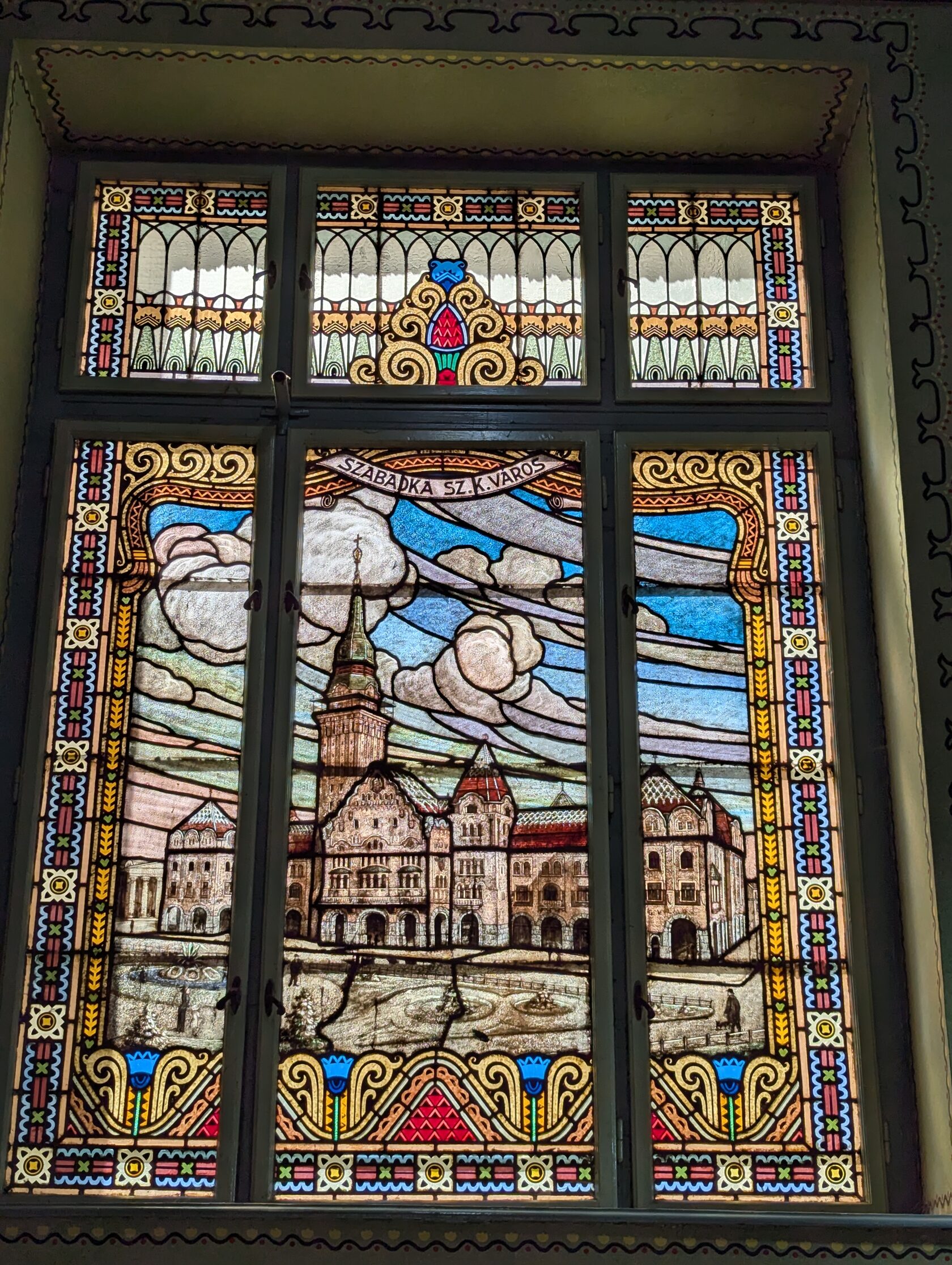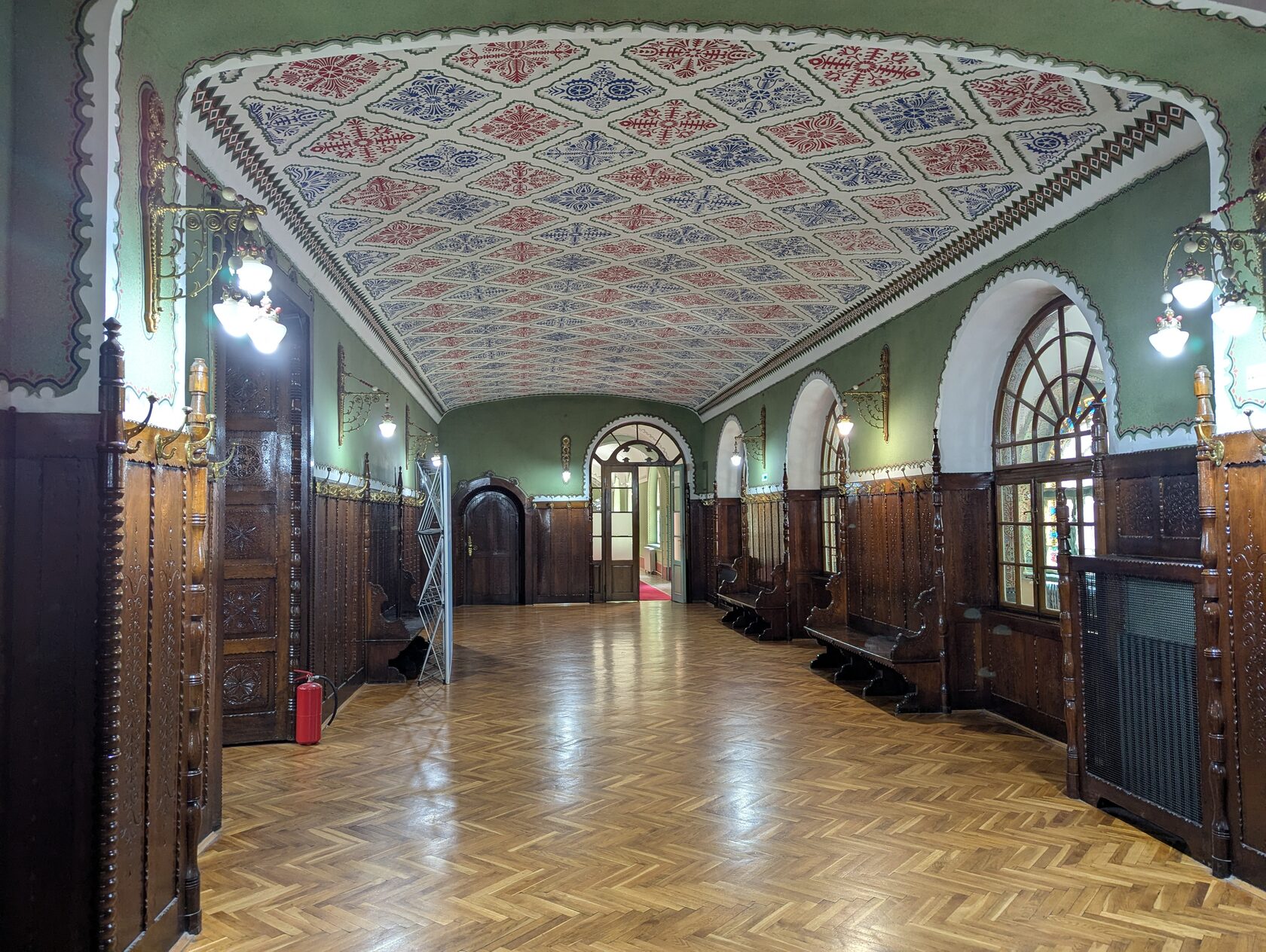 Там три зала: Зелёный, Жёлтый и главный — Актовый. В нём — шестнадцать витражей яркого колорита: работы Микши Рота и художника Шандора Надя.