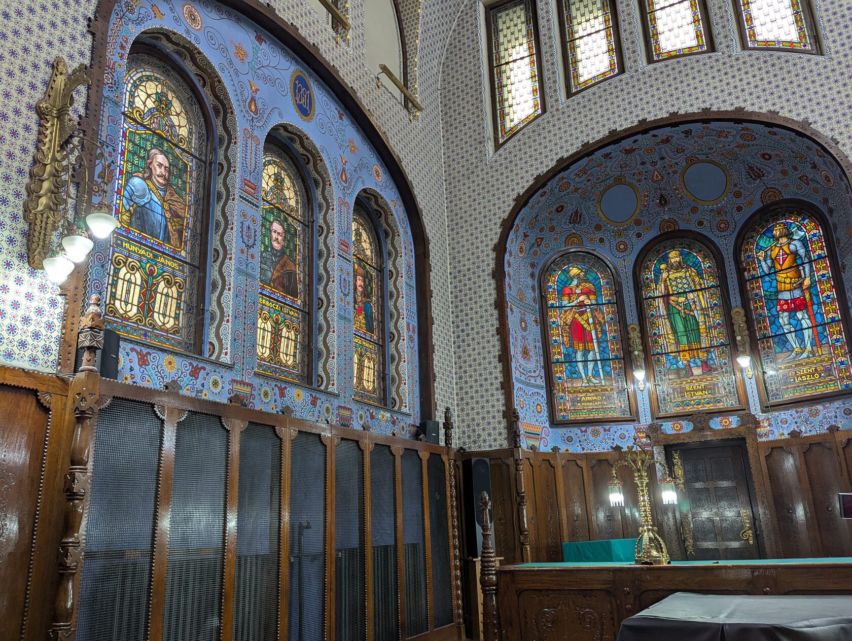 И внутри у Ратуши, построенной на пару лет позже теми же мастерами, немало общего с Синагогой: яркость и жизнерадостность, изобретательность и множество интересных деталей - продукт соединения народной венгерской культуры Трансильвании с сецессией - модерном.