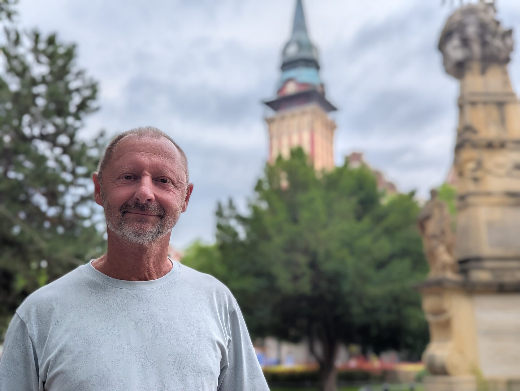 Большое здание на центральной площади, по диагонали от Ратуши. На её ярком фоне кажется строгим и теряется за зеленью деревьев.