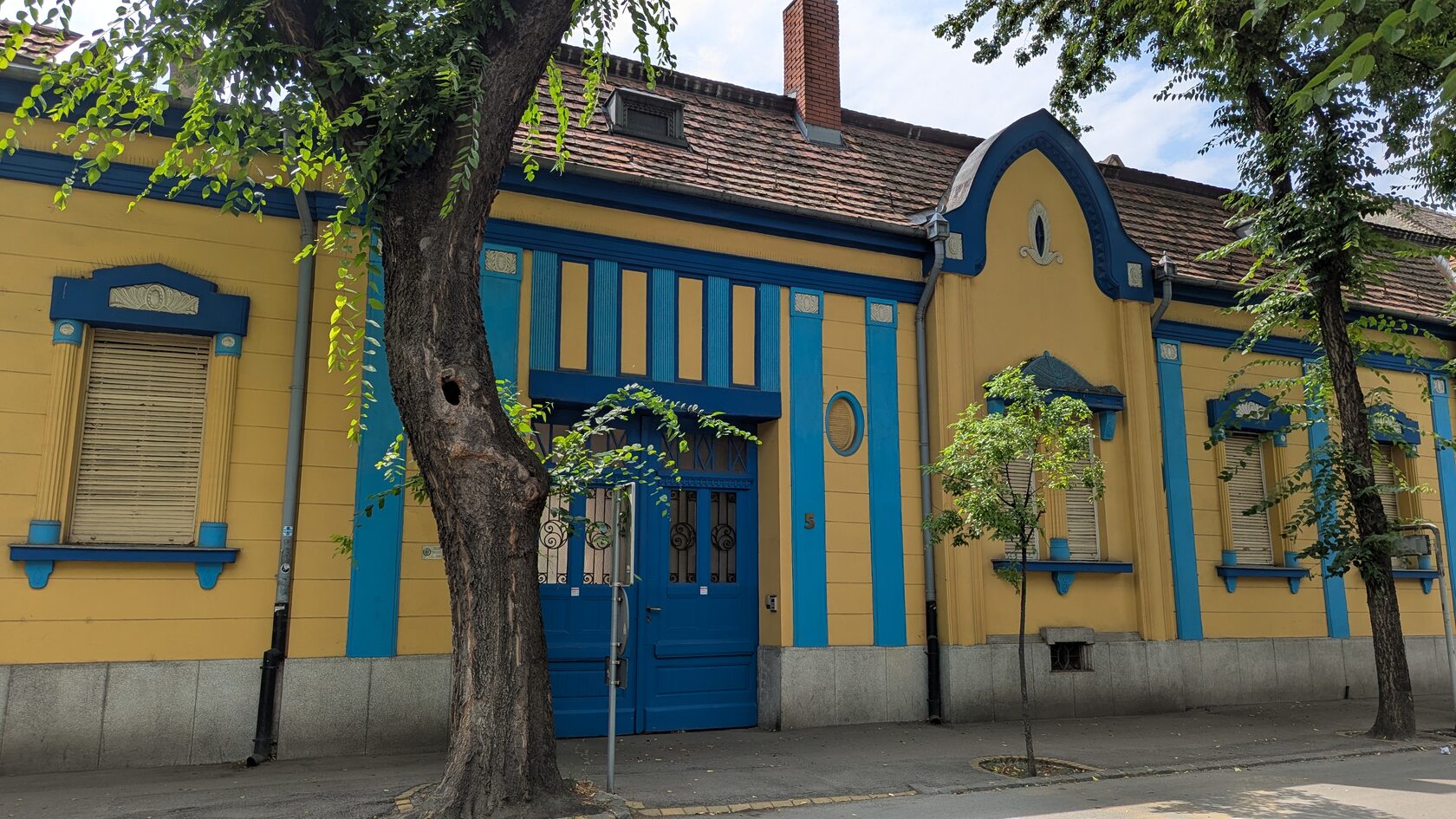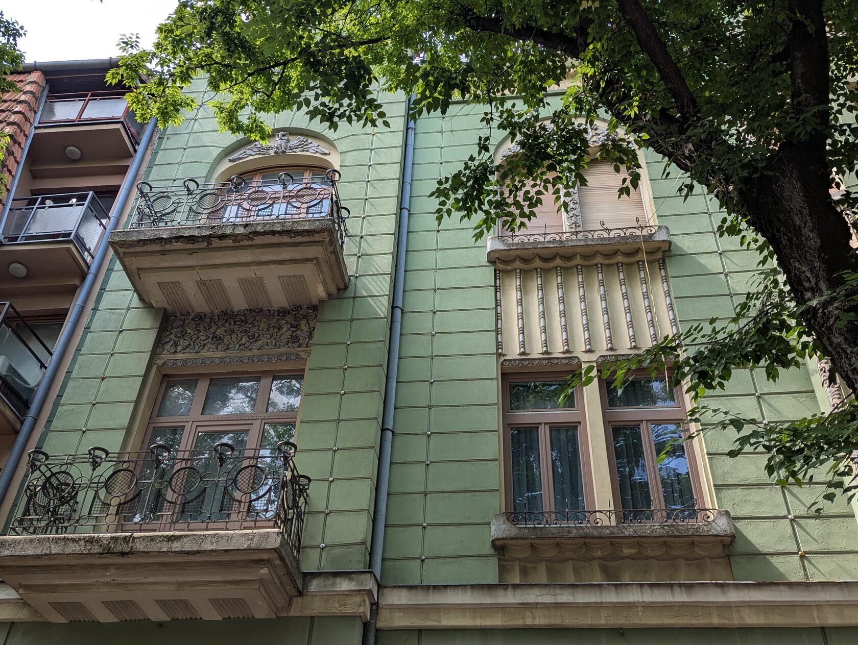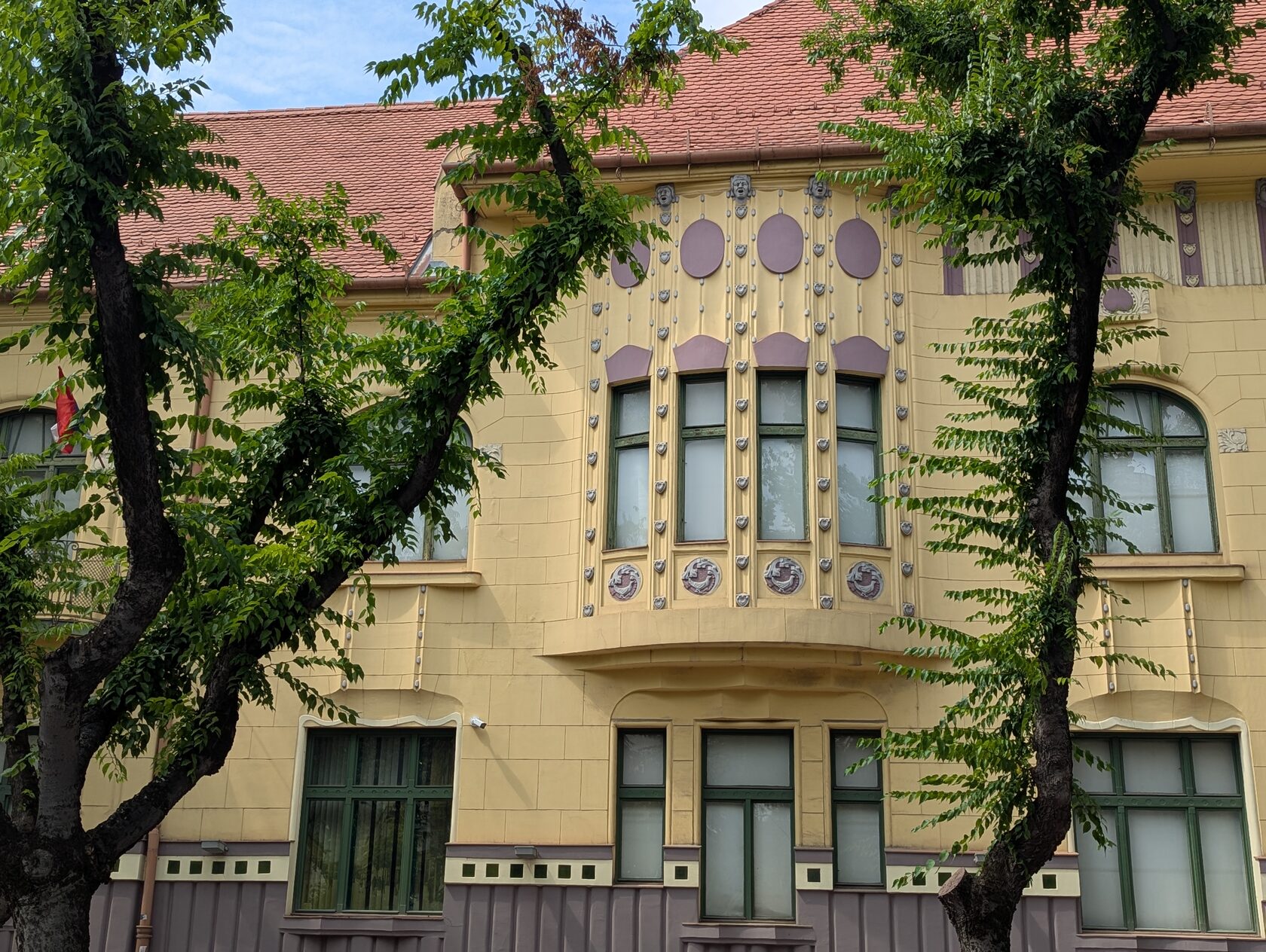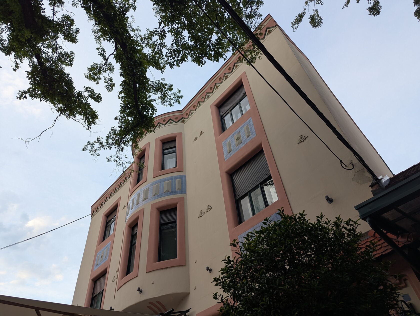 Жёлтое здание с сиреневым цоколем и украшениями на стенах, зелёными рамами, двумя эркерами, разными окнами, перевернутыми сердечками (как у Райхла) и маскароне под крышей, элементами и богатым декором , изображением птиц на балконе и двери - яркий образец венгерской сецессии.