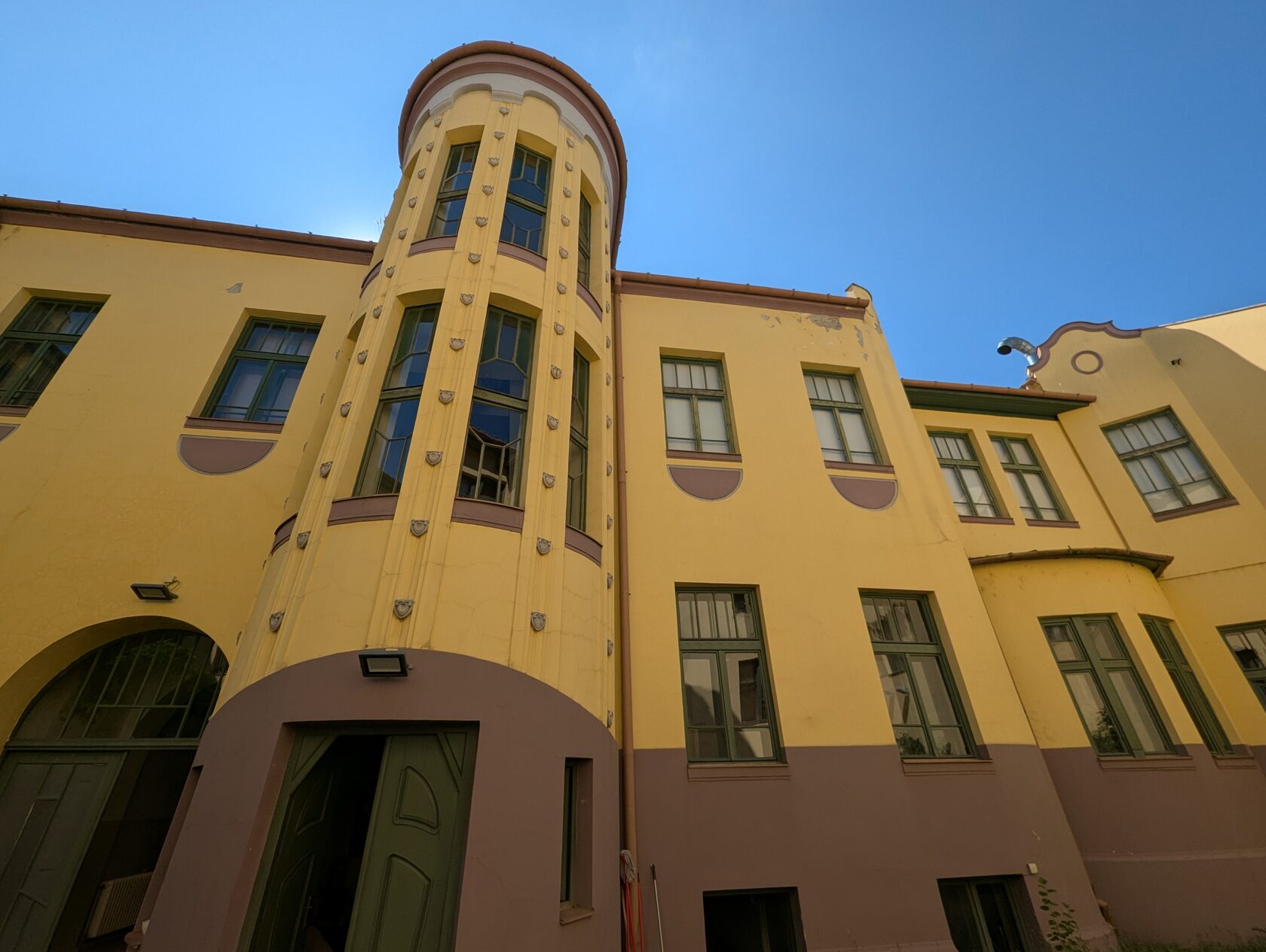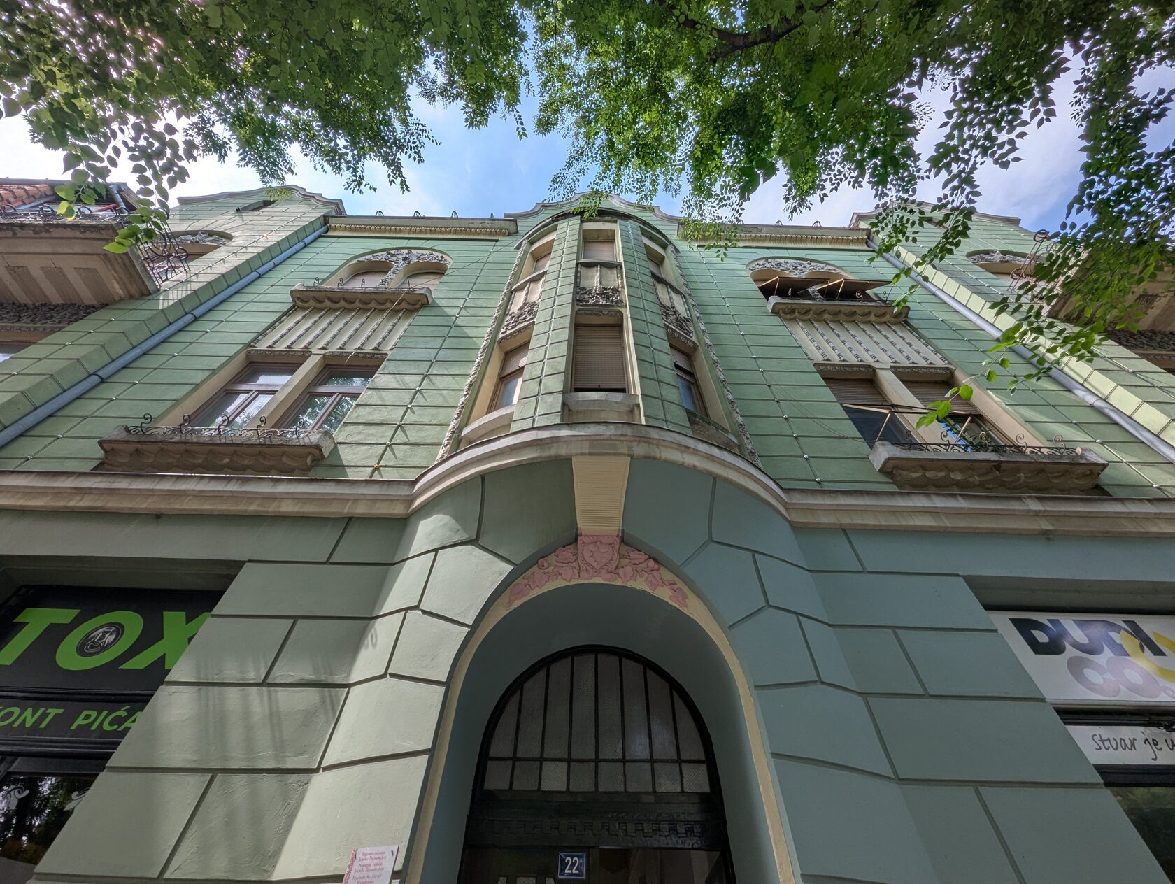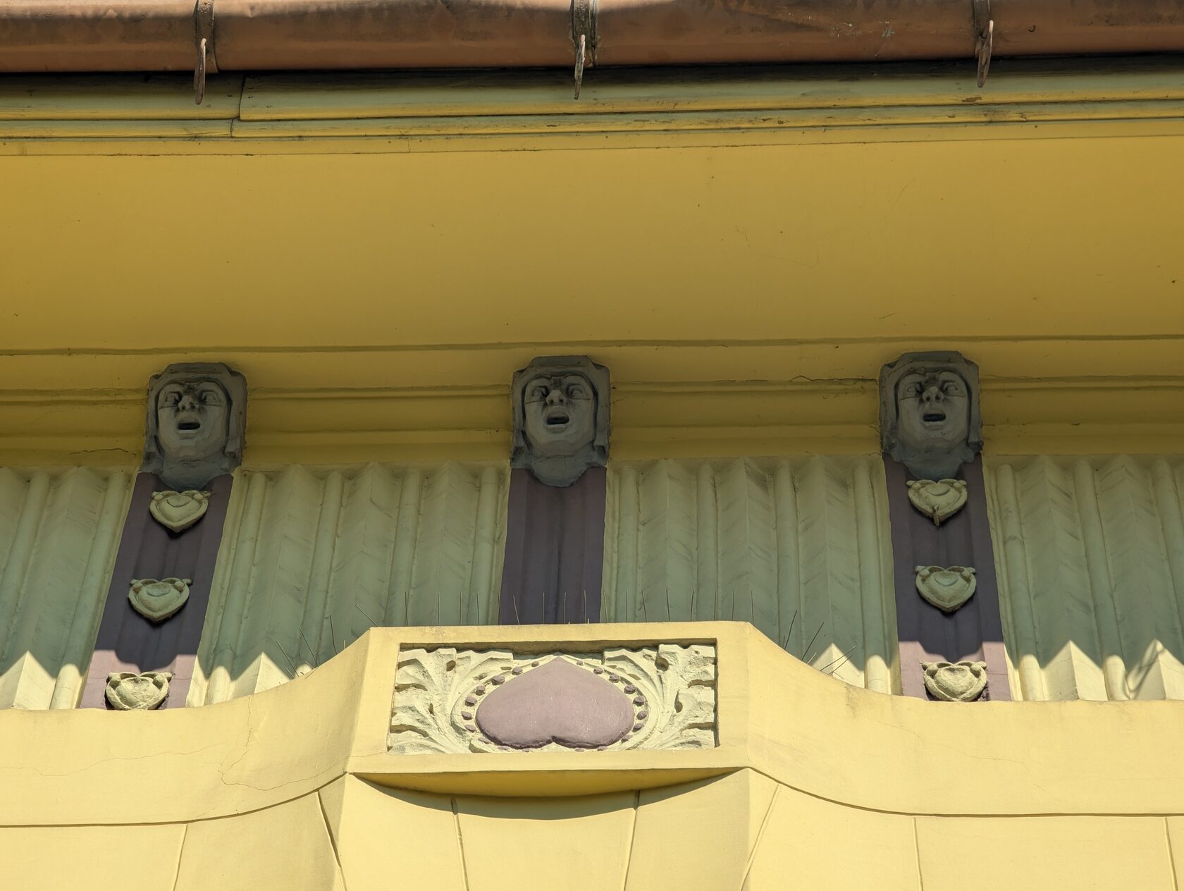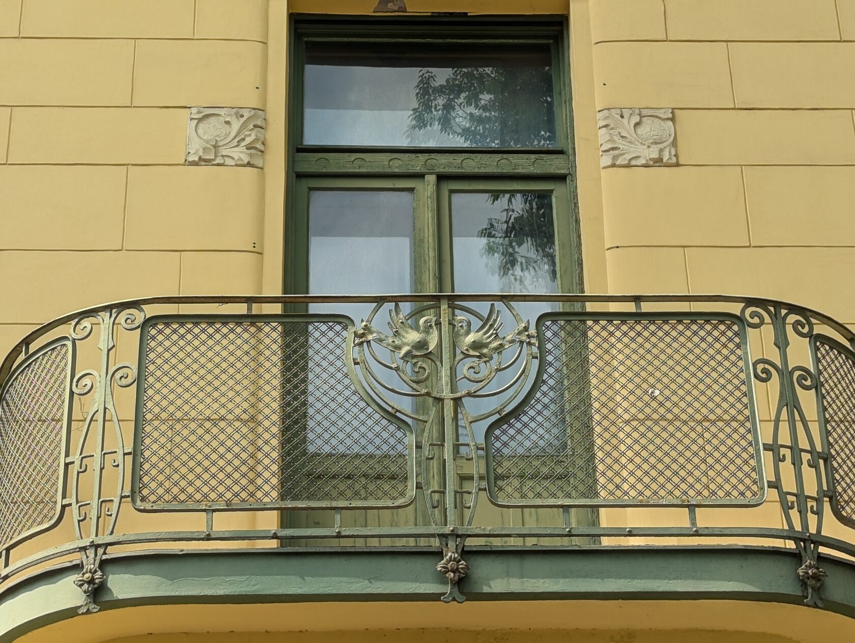 Жёлтое здание с сиреневым цоколем и украшениями на стенах, зелёными рамами, двумя эркерами, разными окнами, перевернутыми сердечками (как у Райхла) и маскароне под крышей, элементами и богатым декором , изображением птиц на балконе и двери - яркий образец венгерской сецессии.