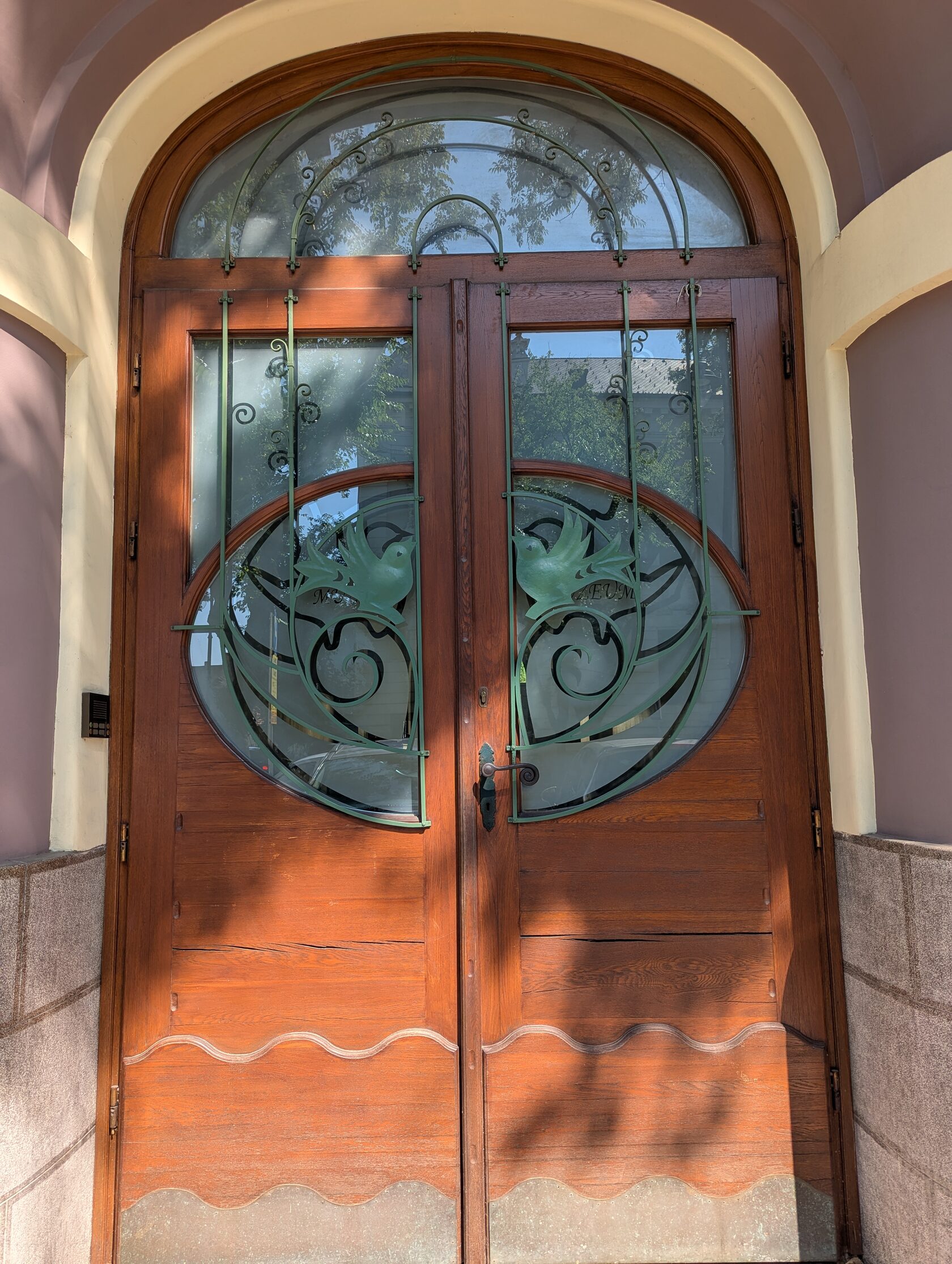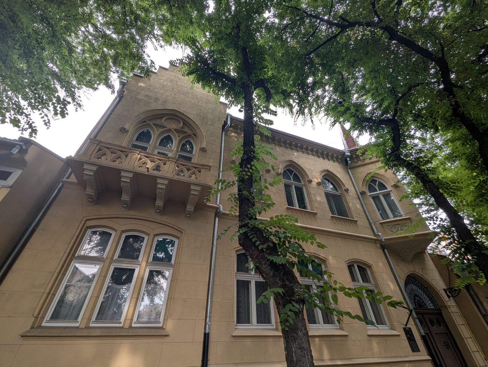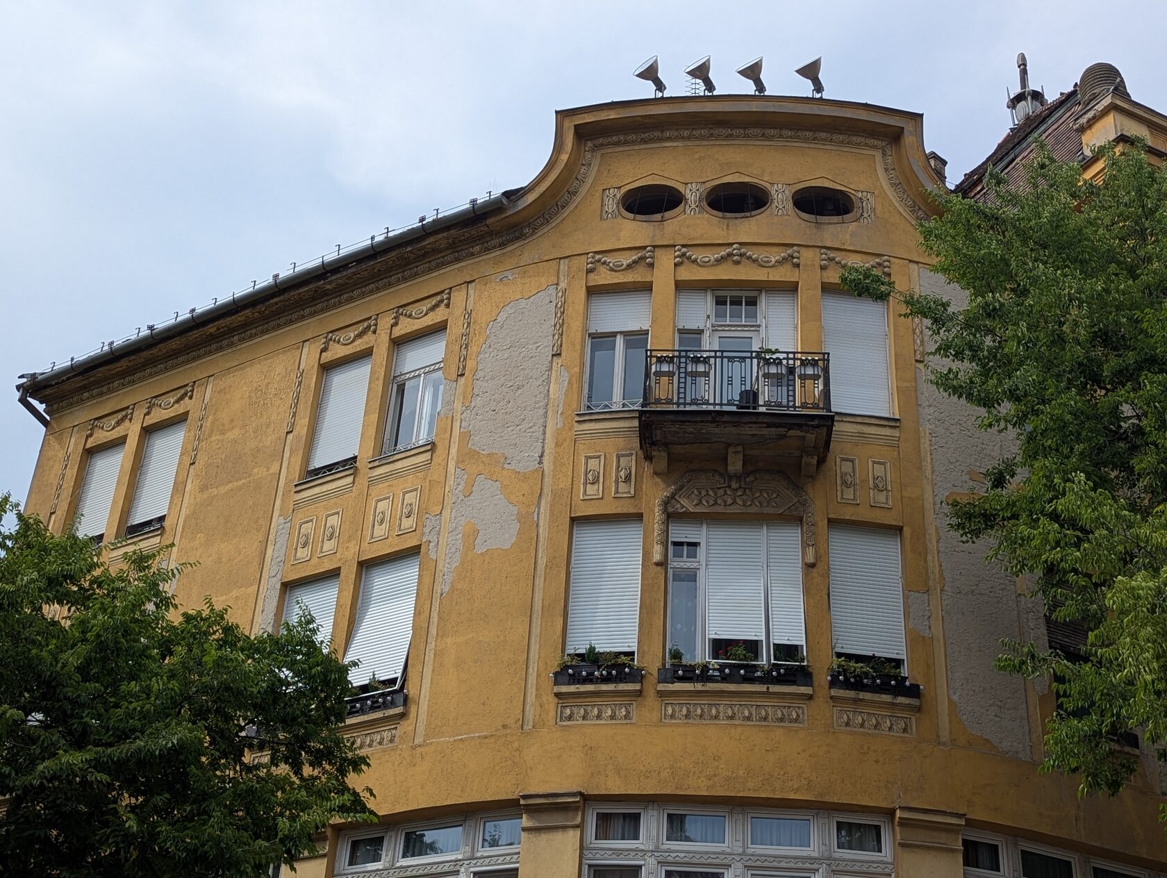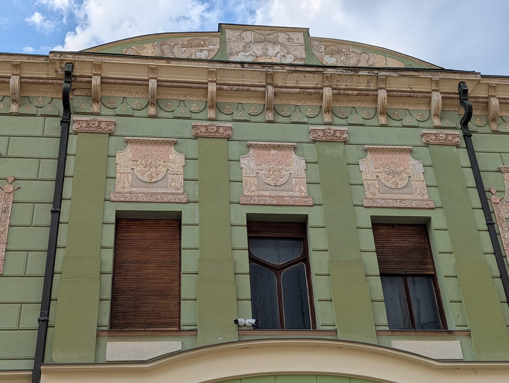 Жёлтое здание с сиреневым цоколем и украшениями на стенах, зелёными рамами, двумя эркерами, разными окнами, перевернутыми сердечками (как у Райхла) и маскароне под крышей, элементами и богатым декором , изображением птиц на балконе и двери - яркий образец венгерской сецессии.