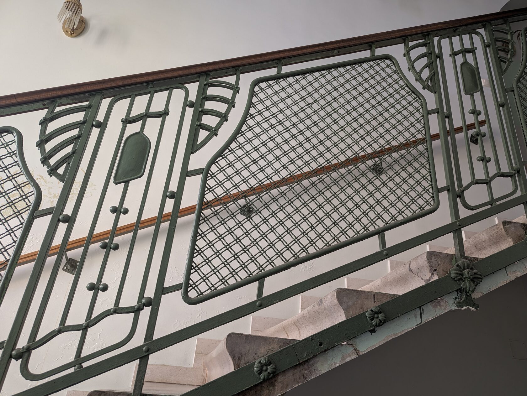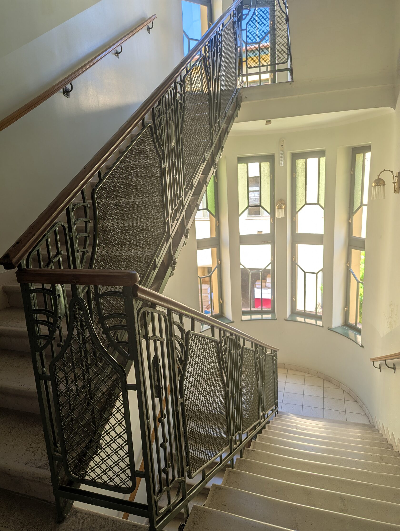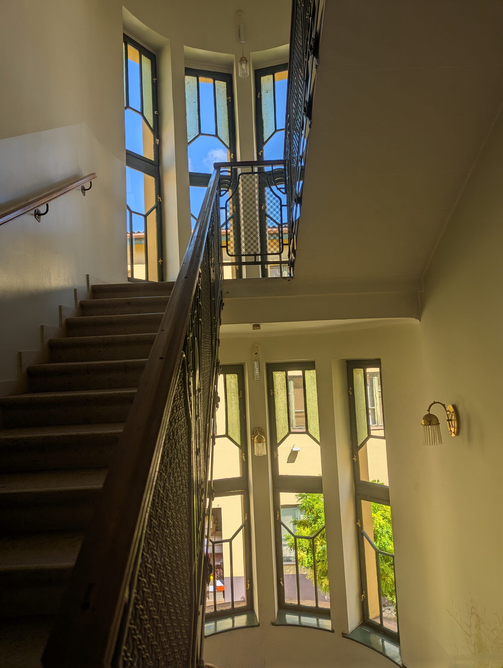 и хорошо сохранившуюся лестницу с окнами и витражами
