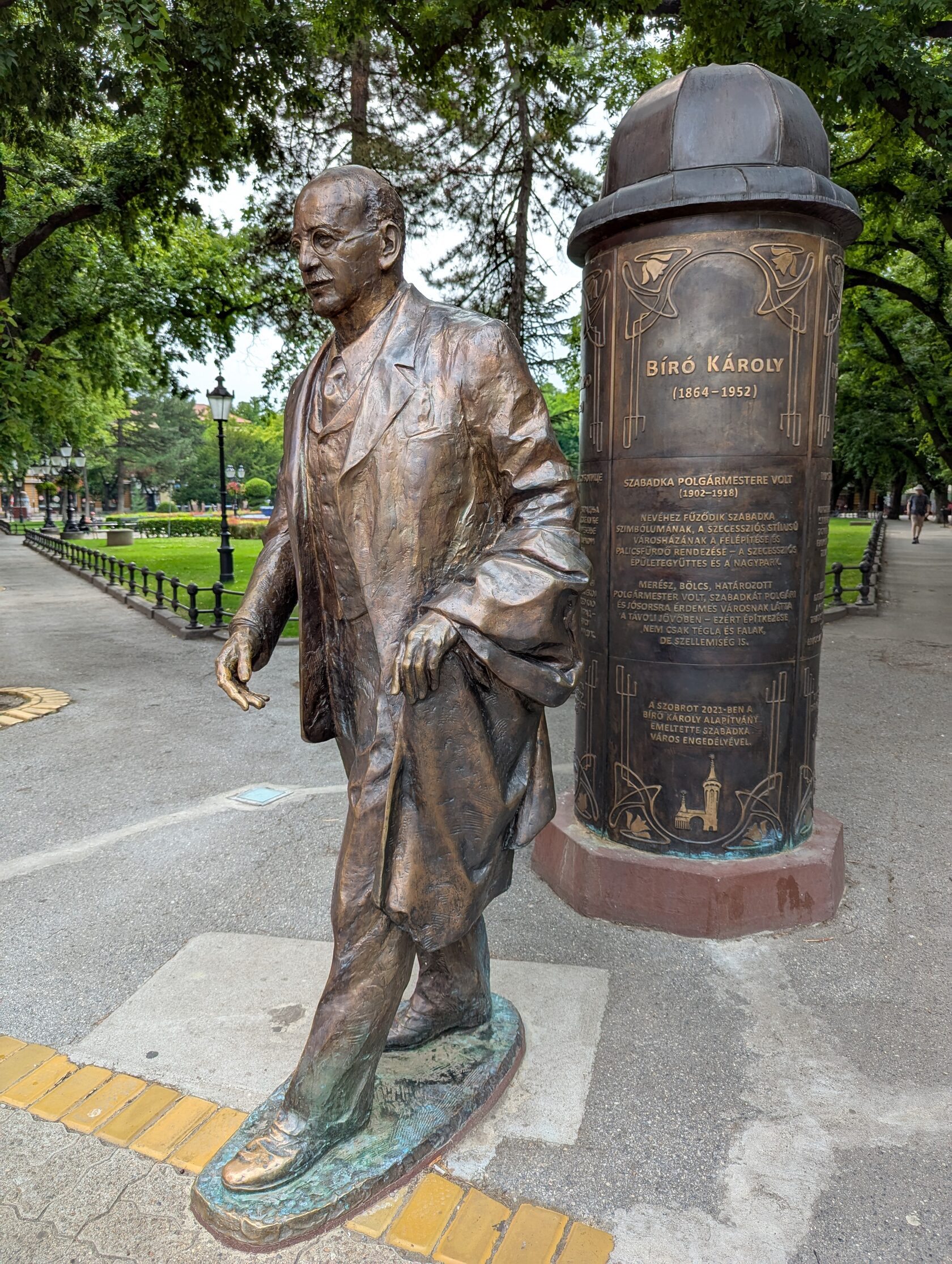 Идущий через площадь к созданным благодаря нему зданиям и улицам Суботицы скульптурный Биро Кароли - достойный пример для нас: властей и творцов, создающих общественную жизнь и культуру - пример для наших времён.