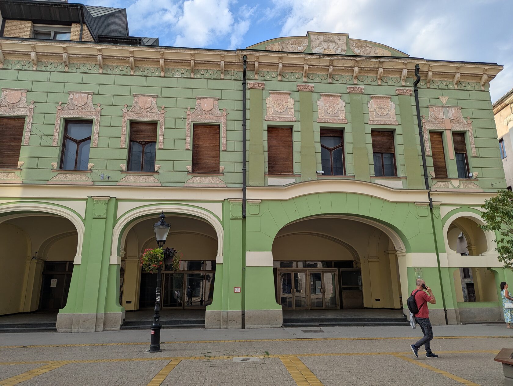 был Пал Вадас. Своей современной концепцией, упрощёнными формами, строгой конструкцией с башней и выбором хороших материалов он создал здание иной эстетики. Но, если приглядеться, спокойные, аскетические геометрические формы стиля модерн здесь украшены и смягчены человеческими фигурами на золотом фоне ниже угловой башни, сине-белой мозаикой между окнами и стилизованными изображениями птиц в нижней части эркера, масками, изготовленными из кованого железа, над входной дверью.
