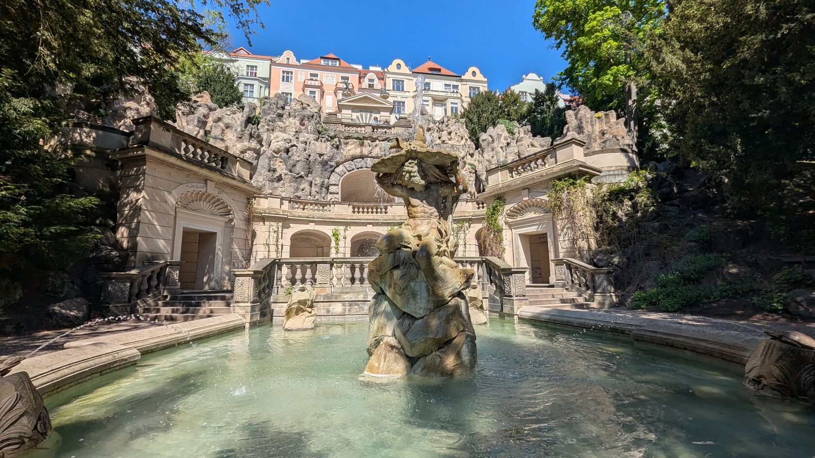 И за ним мы видим здания модерна, над нео-барочным фонтаном и гротом