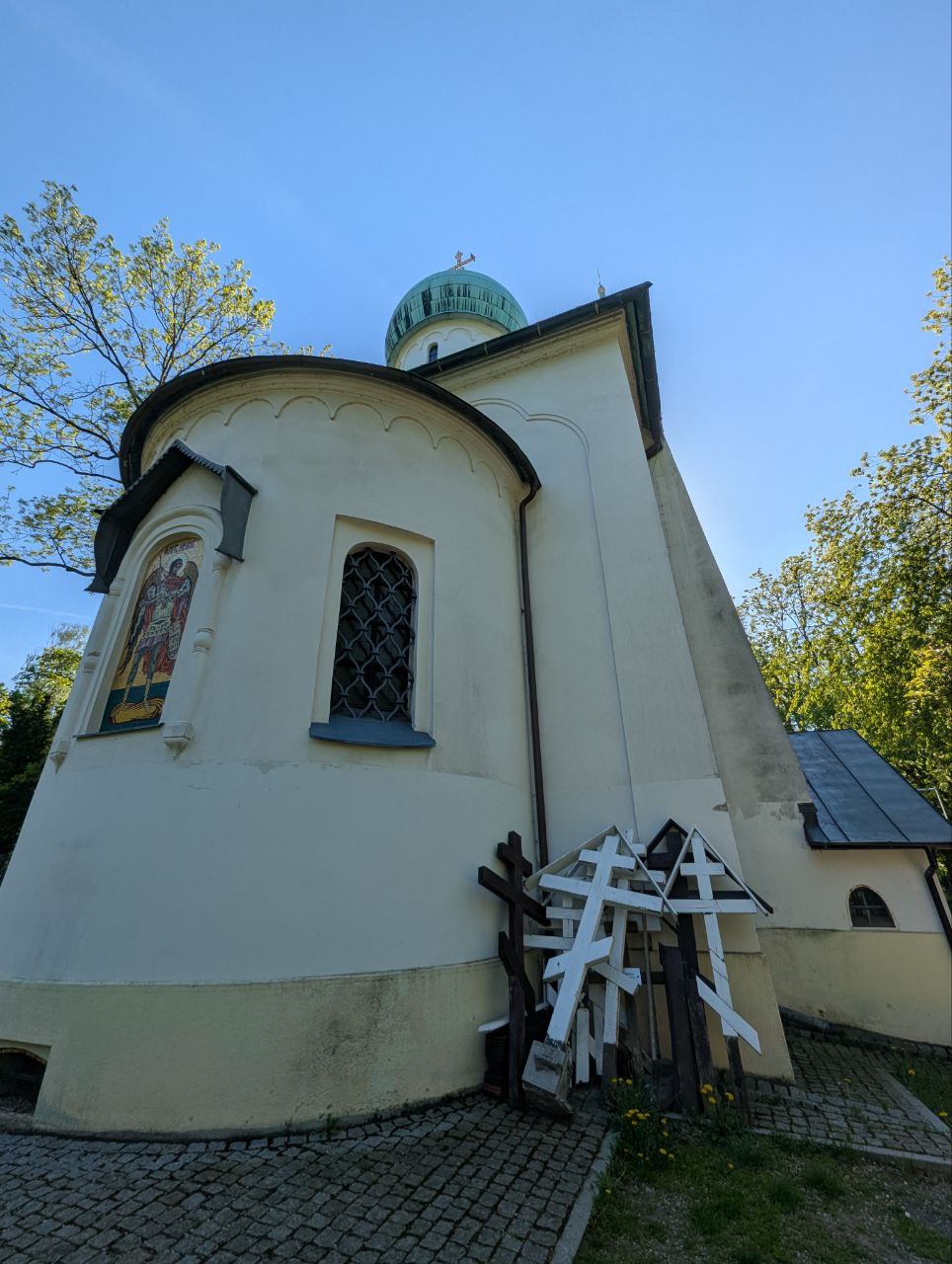 А здесь похоронены православные чехи и русские, уехавшие в революцию, их потомки и переехавшие позже. Некоторое время могилы русских эмигрантов были заброшены. Тем не менее стили надгробий разнообразны - от простых деревянных крестов до строгих каменных изваяний. Больше памятников с фотографиями, что редко на католических кладбищах.
