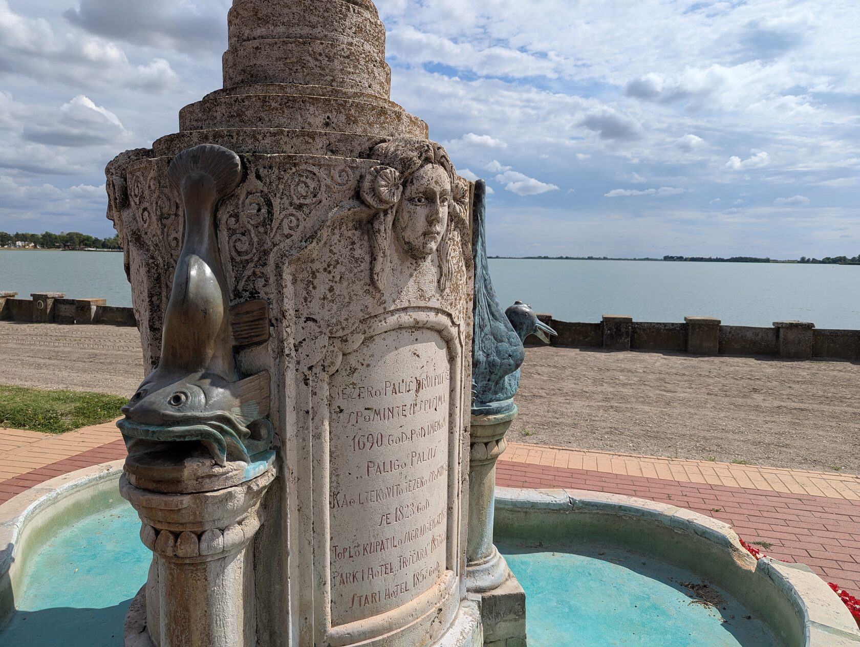 С любимыми модерном женскими масками, помпезной вазой наверху и весёлыми изображениями рыб и водоплавающих. Недаром мы находимся на берегу озера