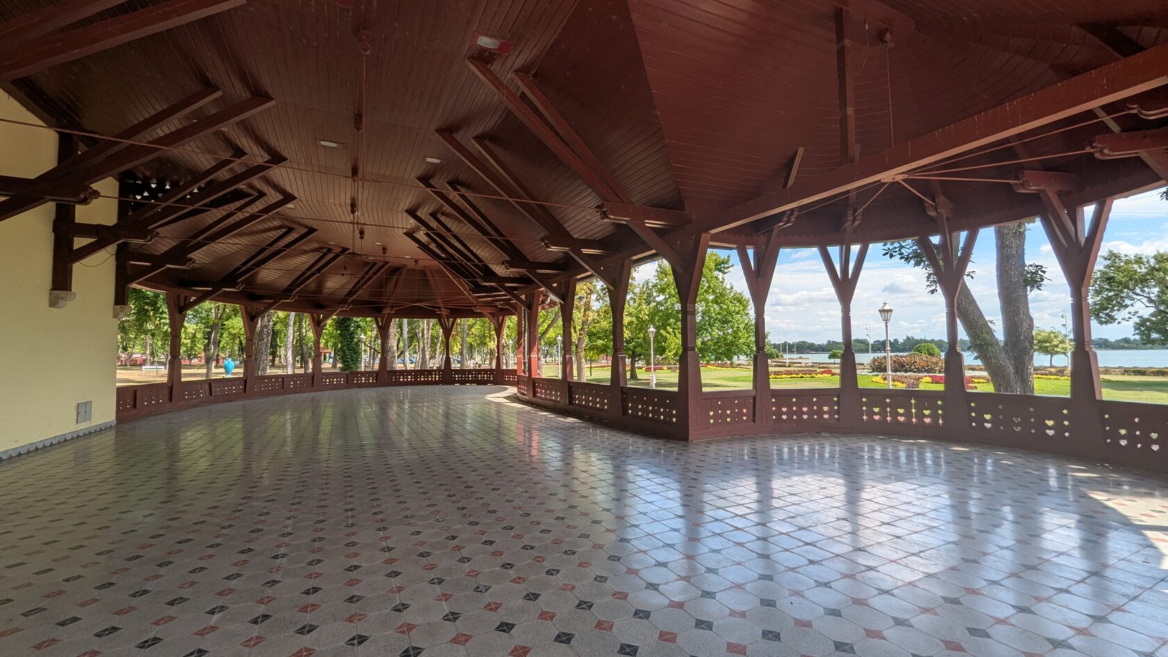 За Большой террасой, на берегу озера, по левой стороне маленькое и изящное здание музыкального павильона в том же стиле. Музыкальный павильон был и остался местом для оркестра во время концертов.