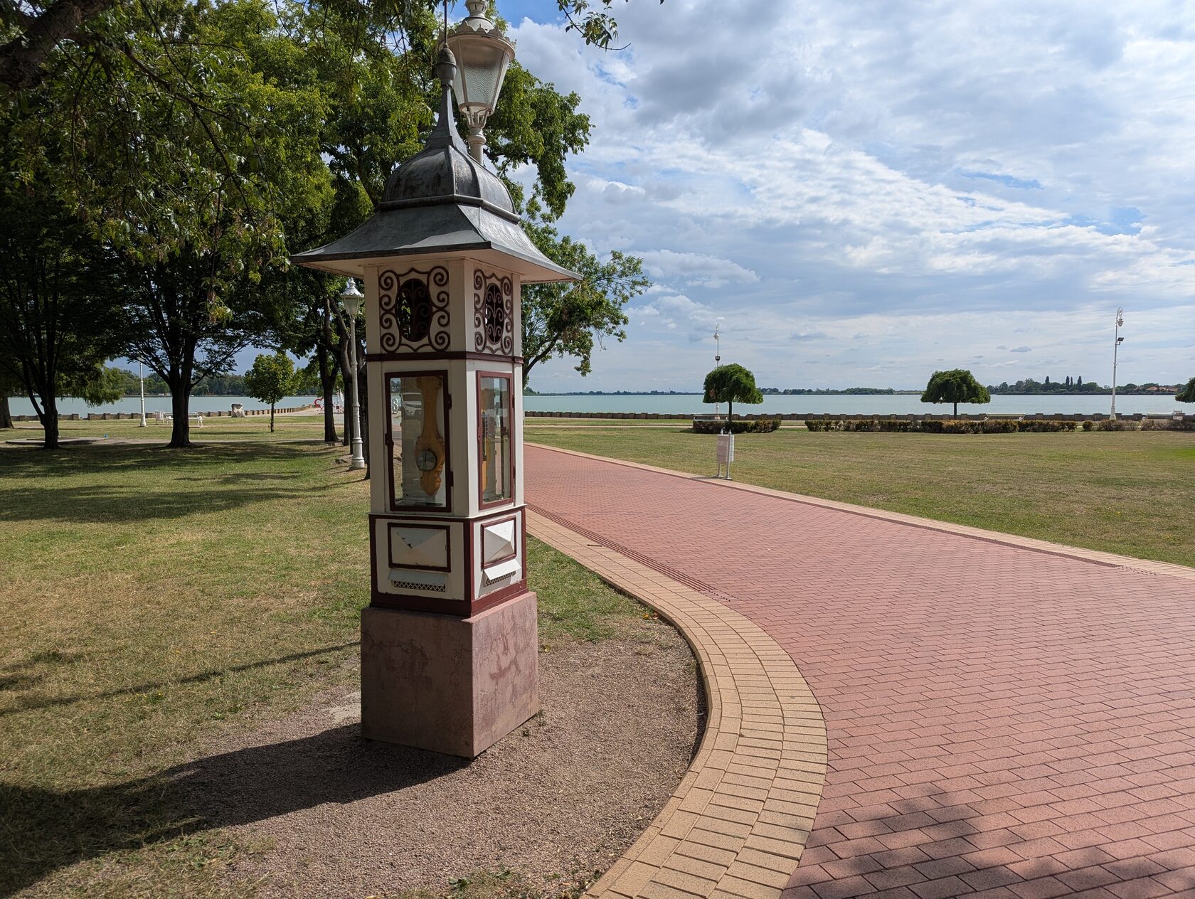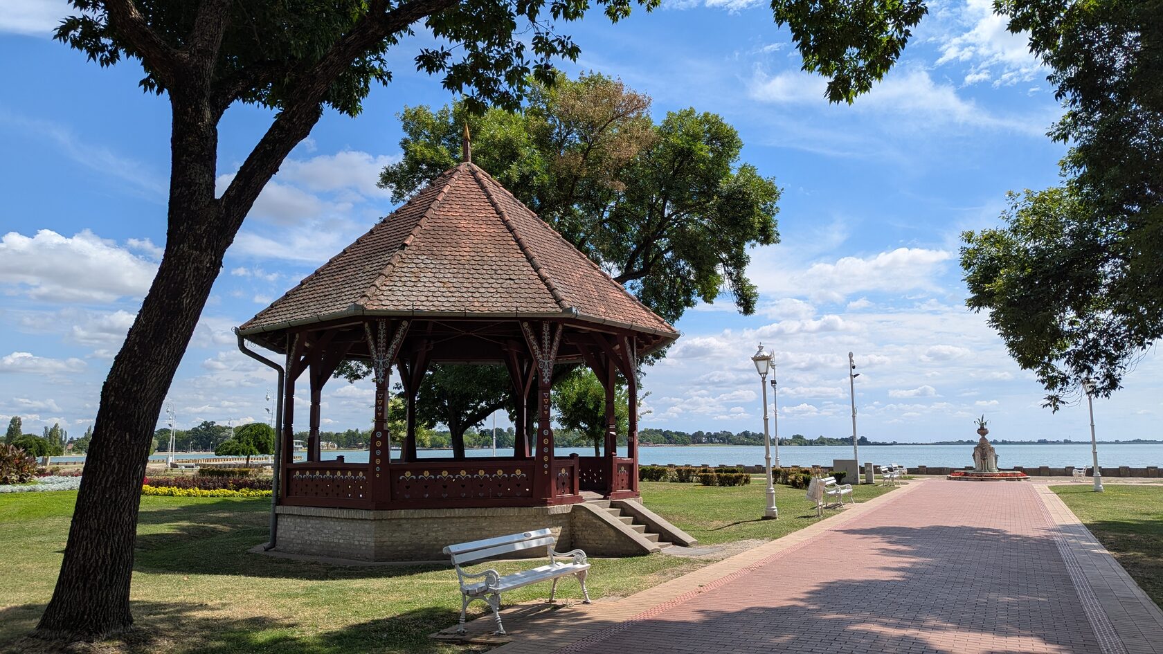 аллея - большая терраса - музыкальный павильон - фонтан - две синие вазы по краям - и женский пляж на озере