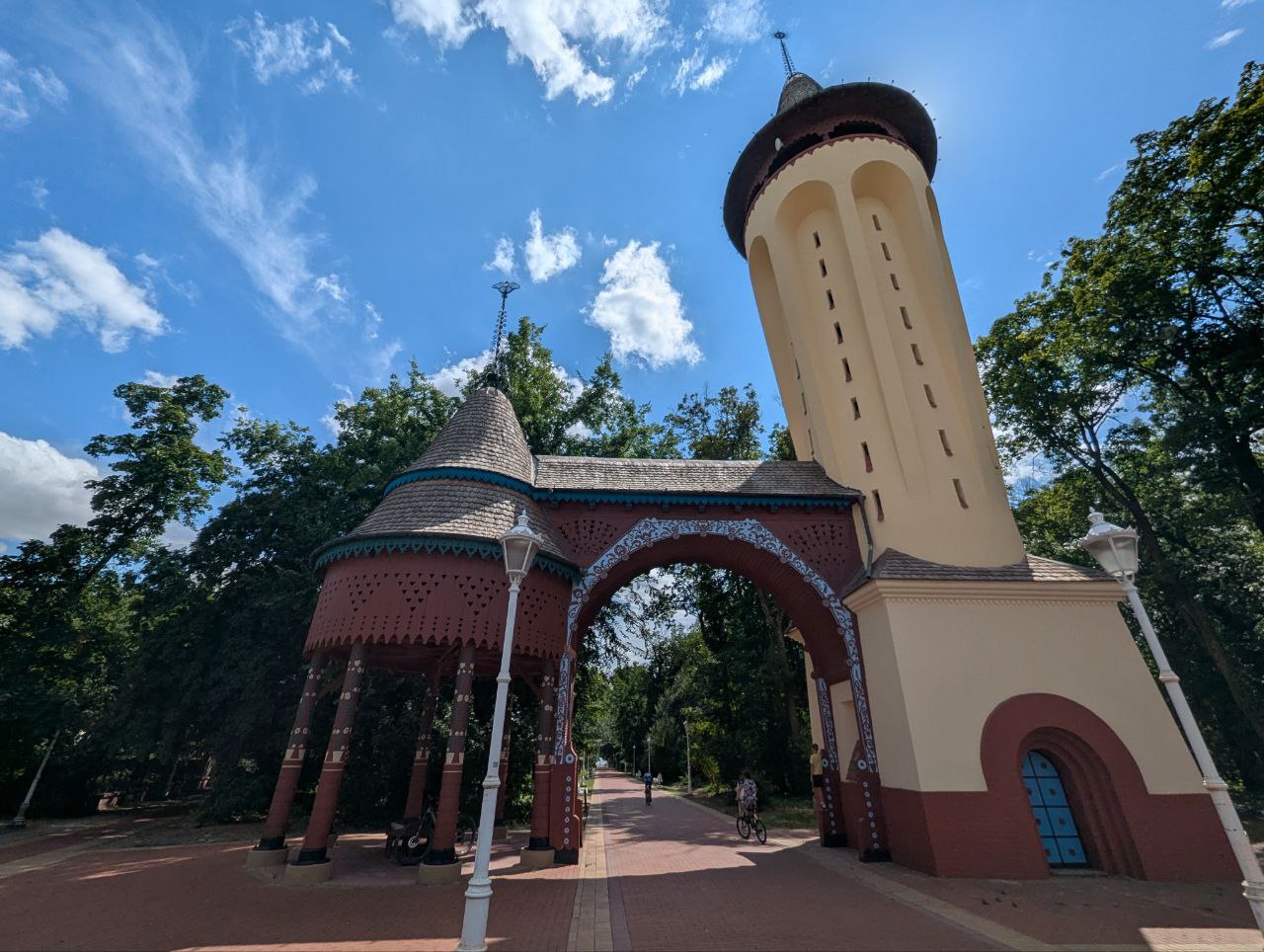 Начнём со входа в парк и центральной аллеи, ведущей к озеру. Их открывает водонапорная башня с воротами...